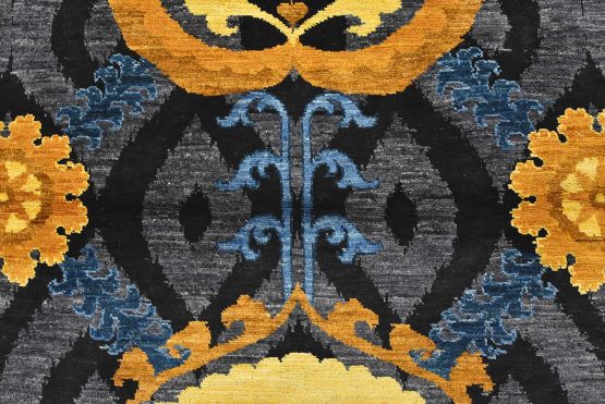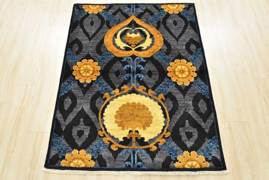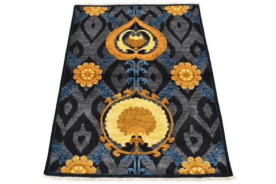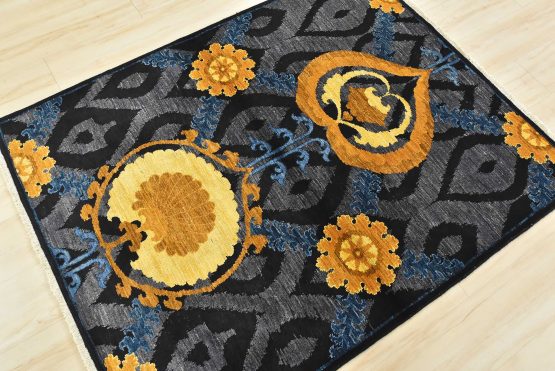 A modern traditional Suzani rug hand-knotted with an all-wool pile on a cotton foundation. This oriental rug features botanical motifs set against an ogee pattern. It is new and in excellent condition.