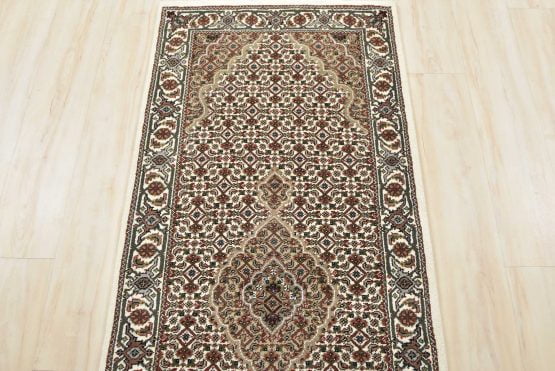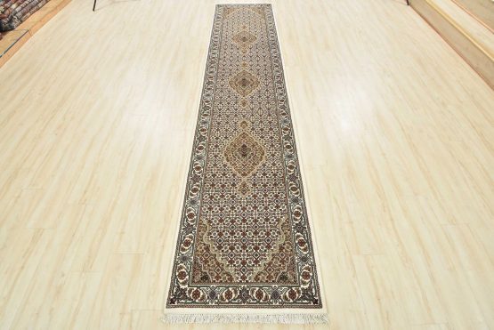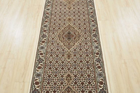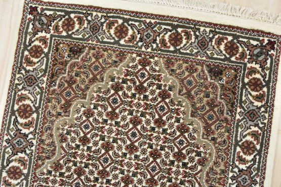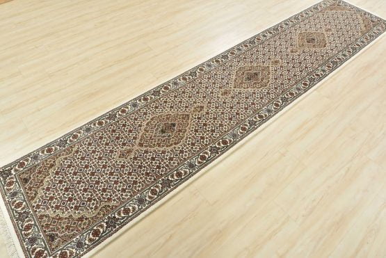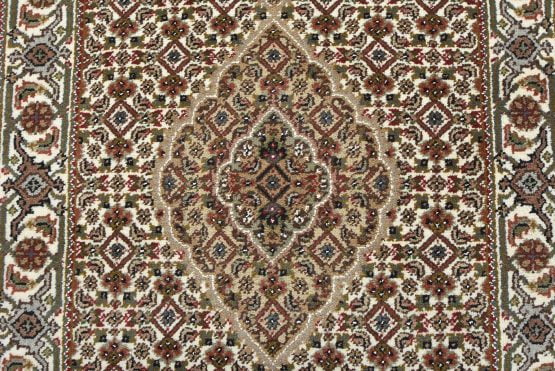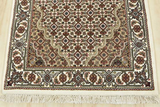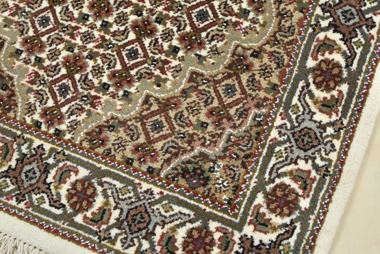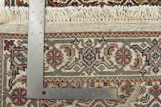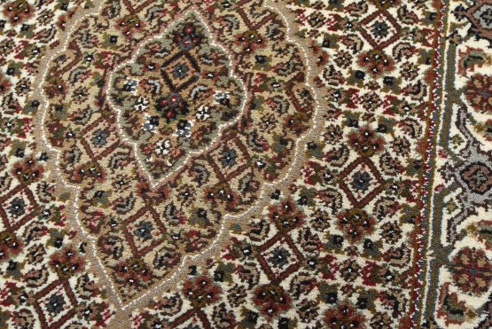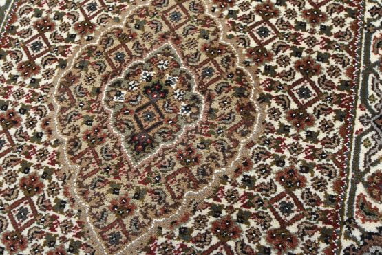 A traditional Tabriz Mahi rug hand-knotted with an all-wool pile on a cotton foundation. This finely woven oriental rug features medallions surrounded by an intricate Herati pattern set against an ivory background. It is new and in excellent condition.