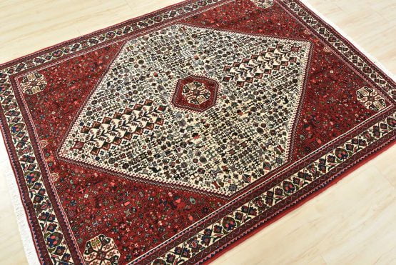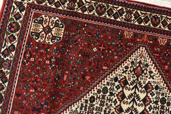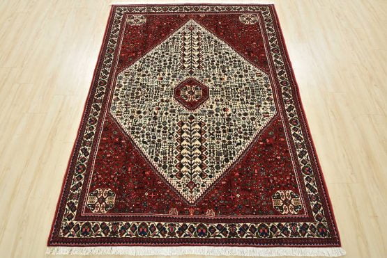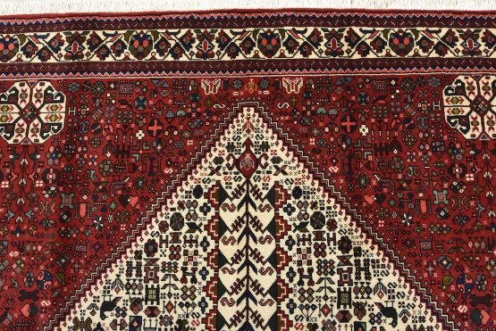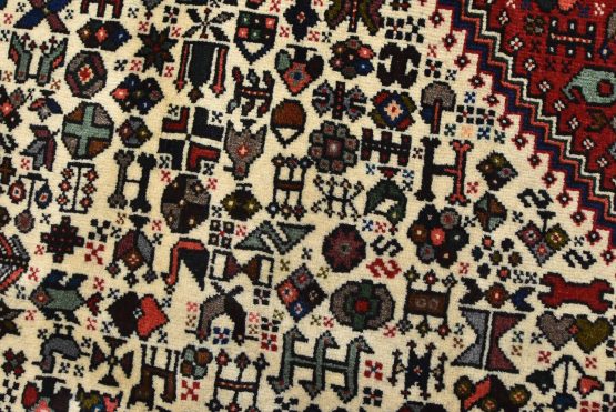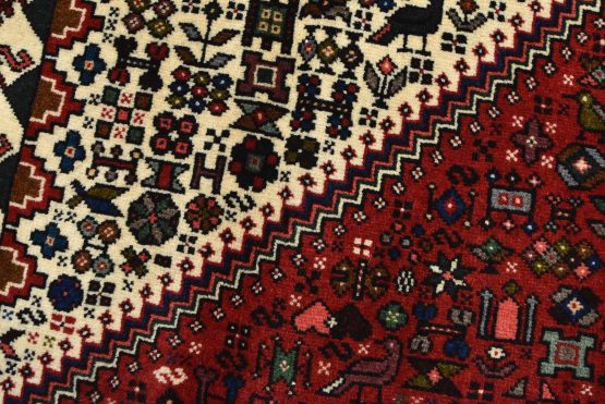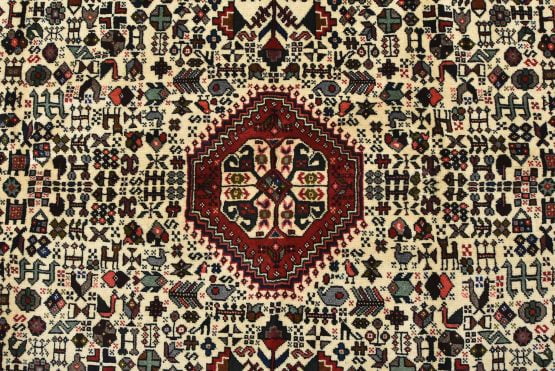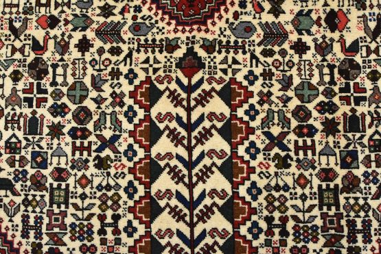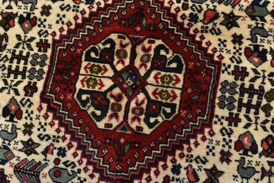 An authentic vintage tribal Abadeh rug hand-knotted with fine wool and natural dyes. This finely woven nomadic rug features a small central geometric medallion surrounded by smaller geometric motifs, including bird and animal figures. It has a full wool pile with no worn areas and is in very good condition.