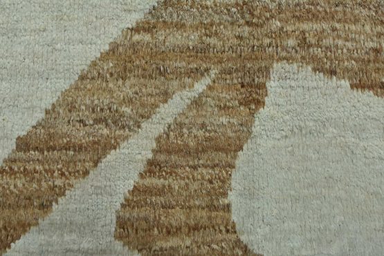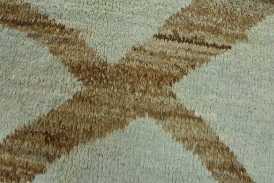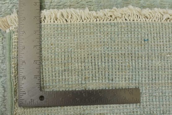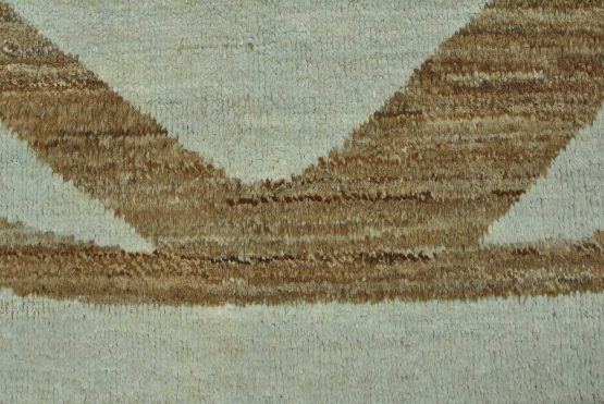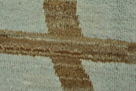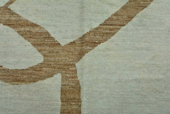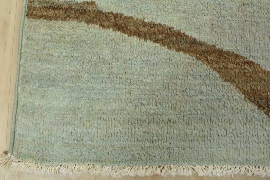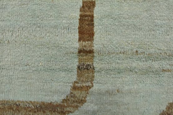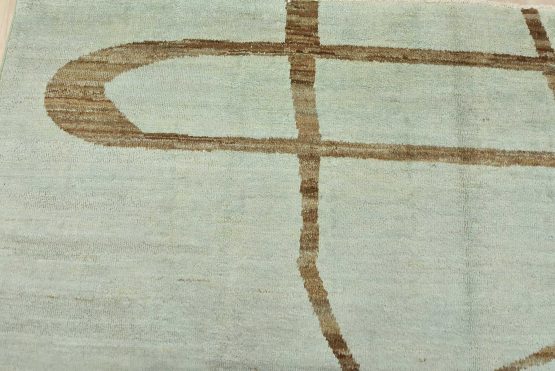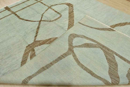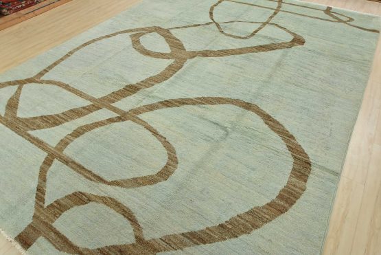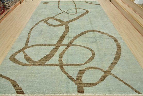 A contemporary abstract rug hand-knotted with an all-wool pile on a cotton foundation. This oriental rug features an abstract design set against a light blue background. It is new and in excellent condition.