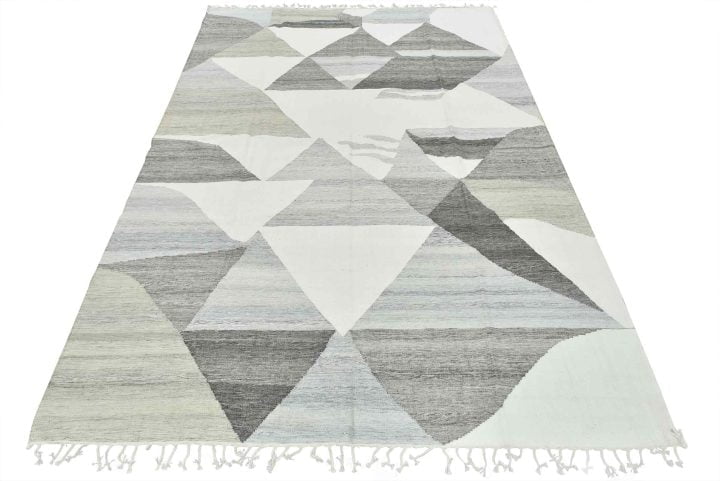 A contemporary kilim rug handwoven with fine wool on a cotton foundation. This area rug features an all-over geometric abstract design. It is new and in excellent condition.