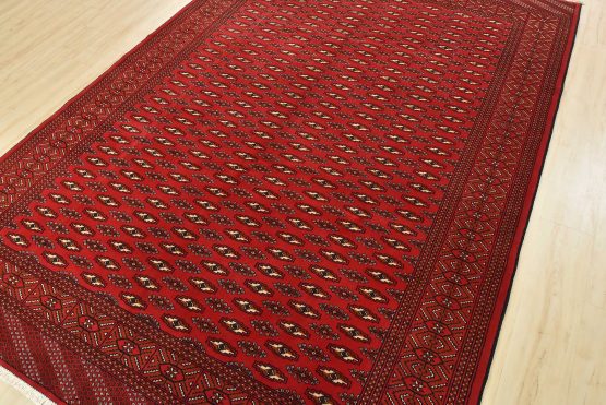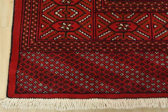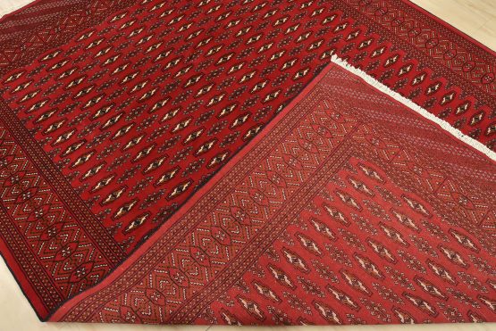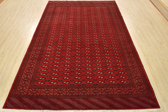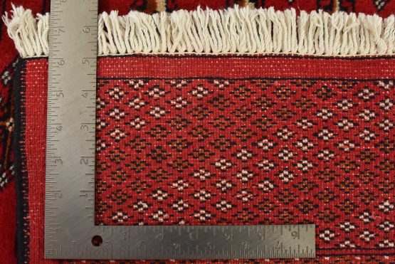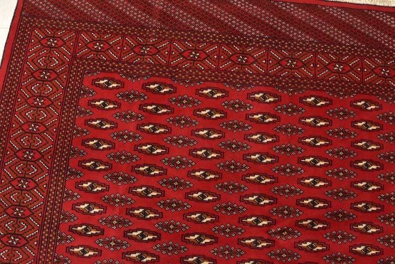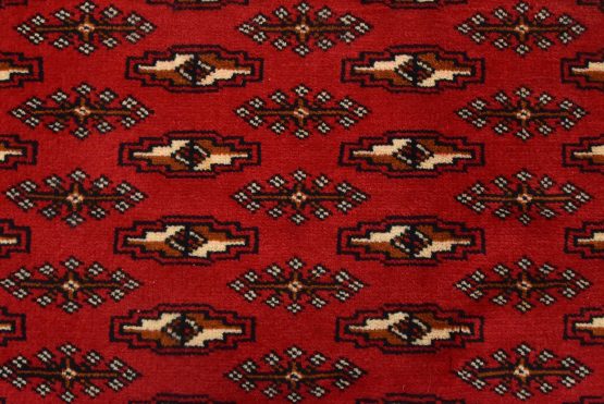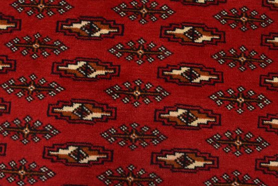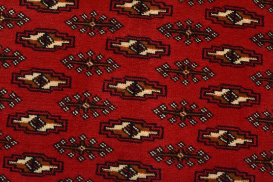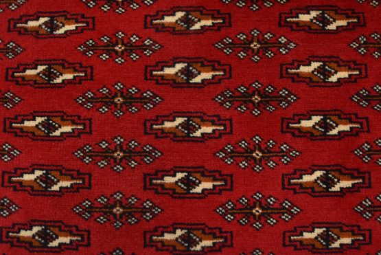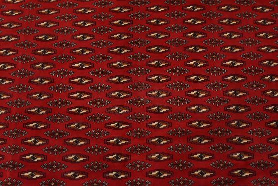 An authentic tribal Turkmen rug hand-knotted with fine wool and natural dyes. This finely woven nomadic rug features repeating rows of small-scale geometric medallions set against a red background. It has a full wool pile with no worn areas and is in very good condition.