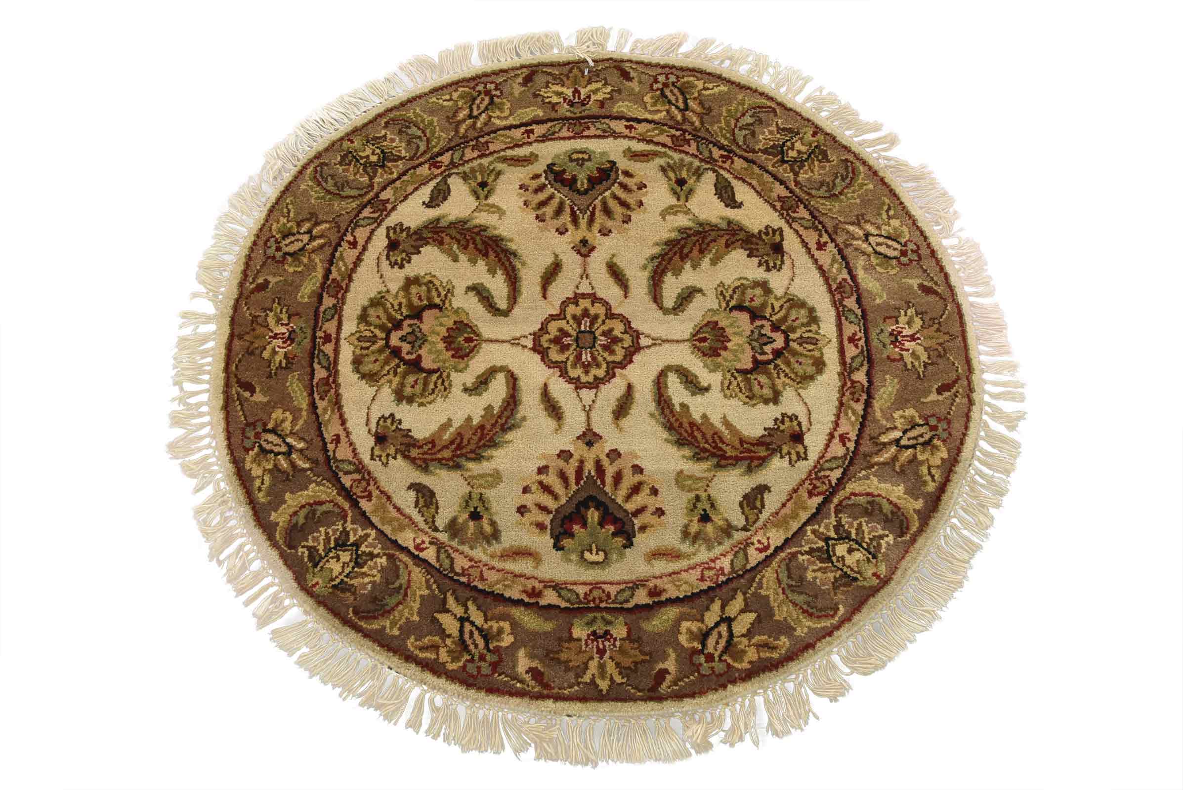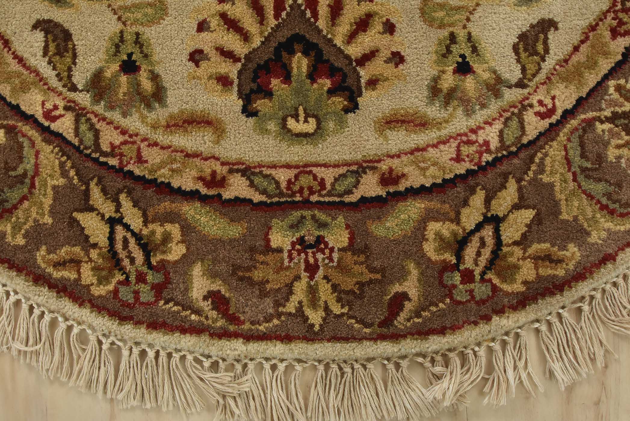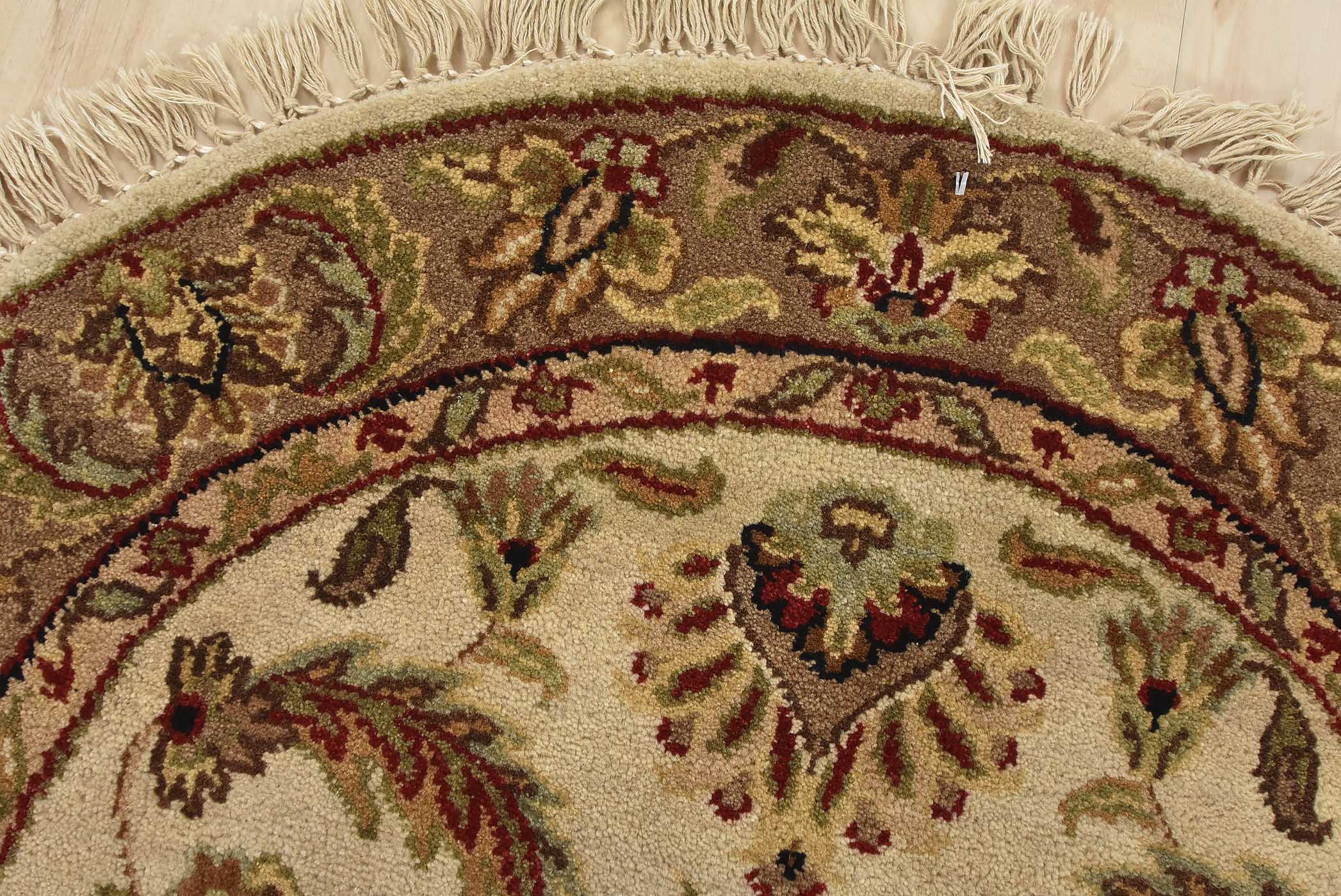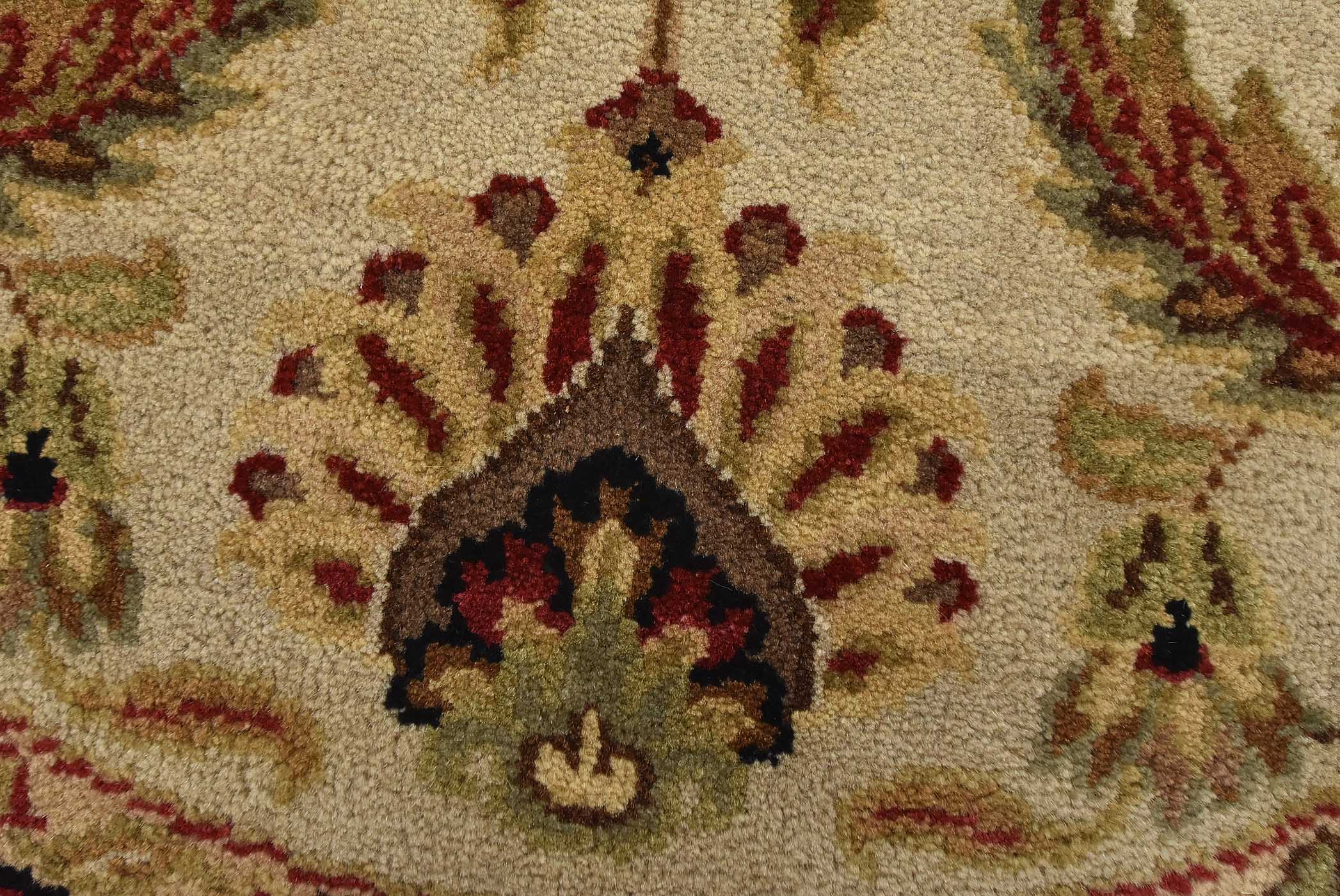 A traditional Agra rug is hand-knotted with an all-wool pile on a cotton foundation. This finely woven oriental rug features a botanical design set against an ivory background. It is new and in excellent condition.