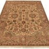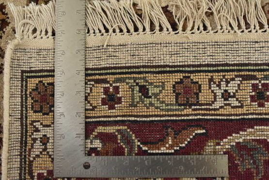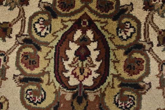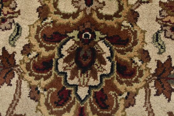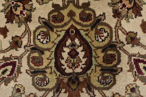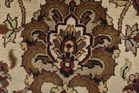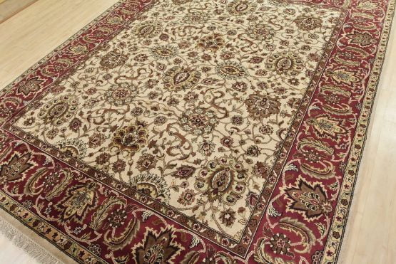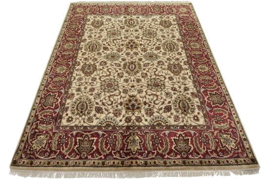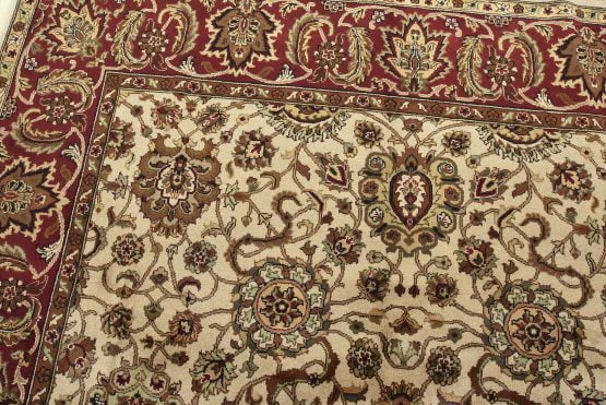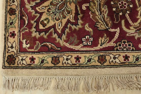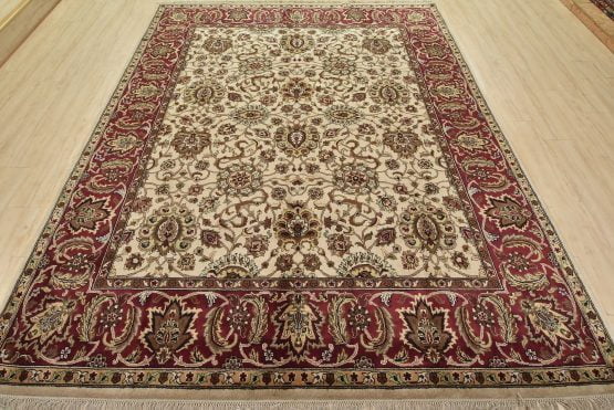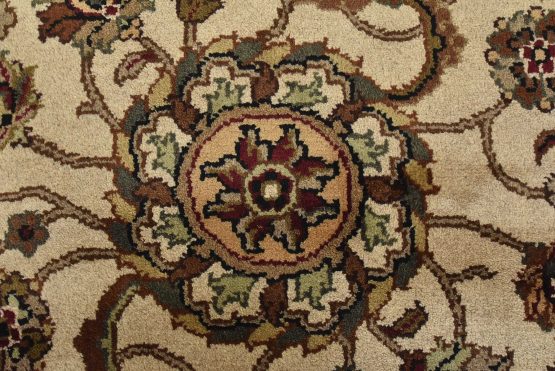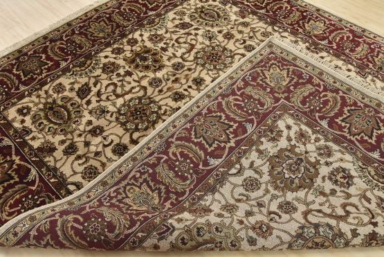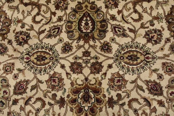 A traditional Agra rug is hand-knotted with an all-wool pile on a cotton foundation. This finely woven oriental rug features an all-over floral design set against a cream-colored background. It is new and in excellent condition.