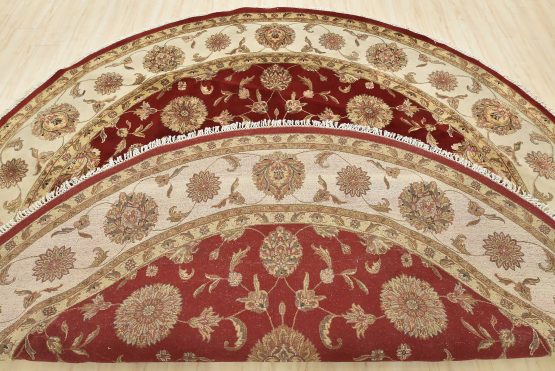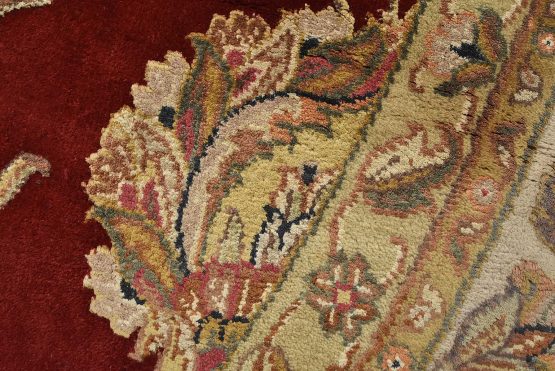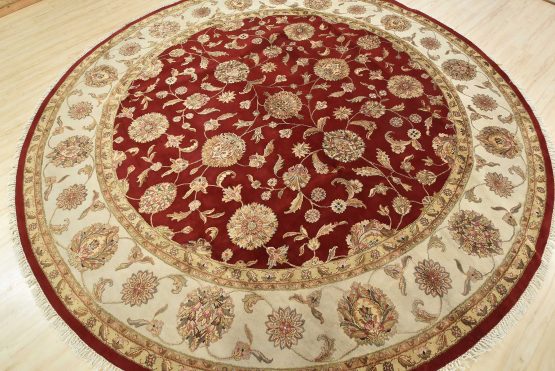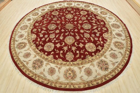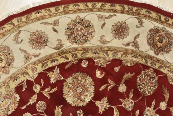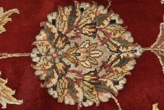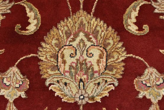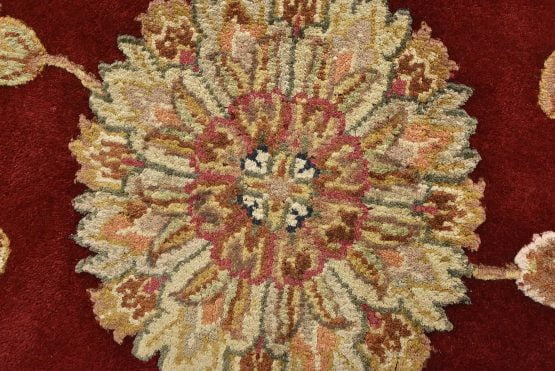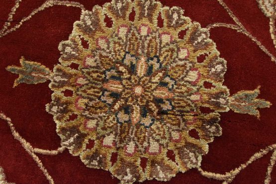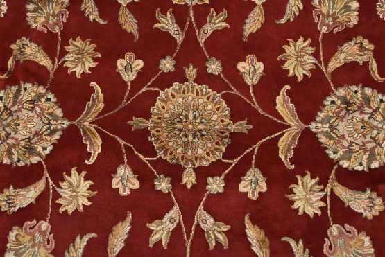 A traditional Agra rug is hand-knotted with a wool and silk pile on a cotton foundation. This finely woven oriental rug features an all-over floral design set against a red background. It is new and in excellent condition.