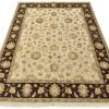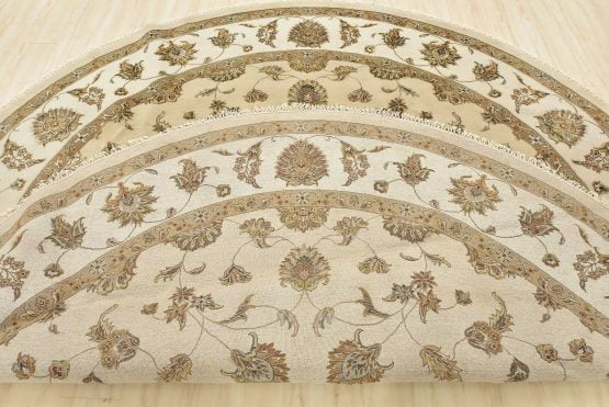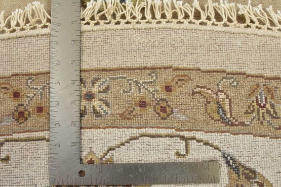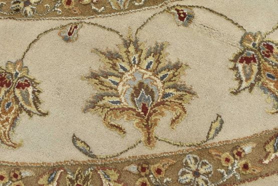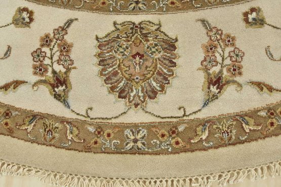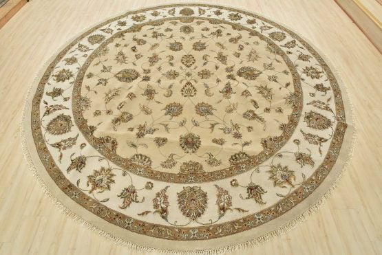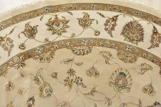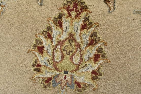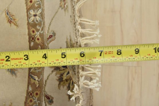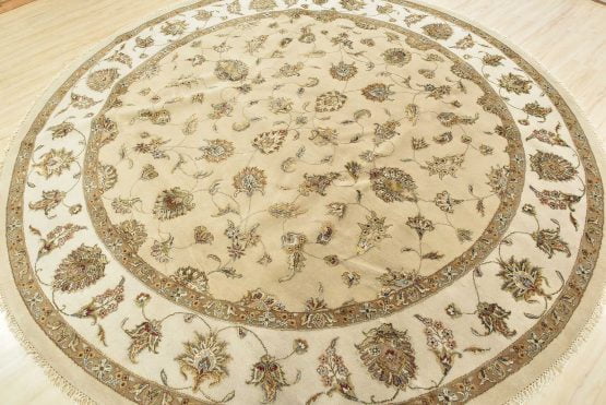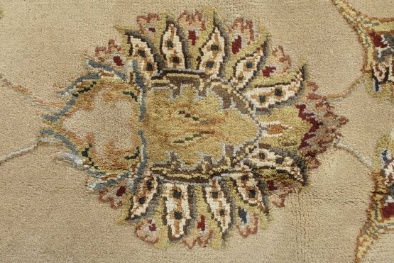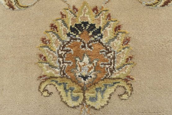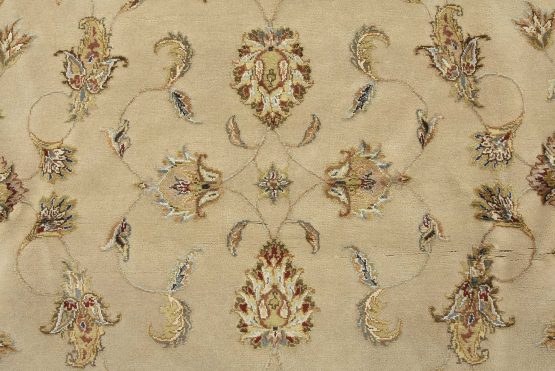 A traditional Agra rug is hand-knotted with a wool and silk pile on a cotton foundation. This finely woven oriental rug features an all-over floral design set against a beige background. It is new and in excellent condition.
