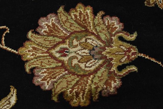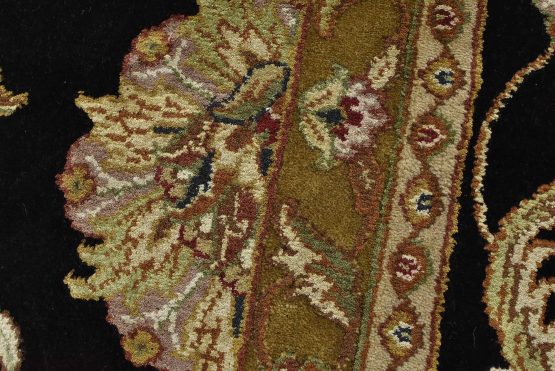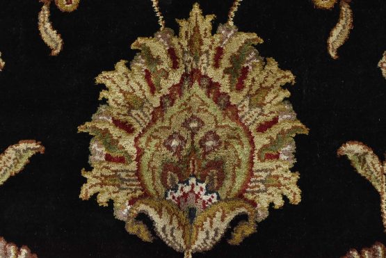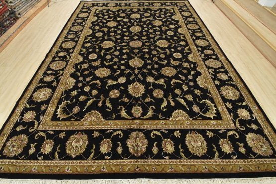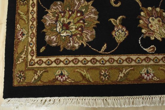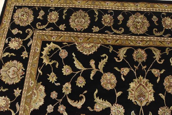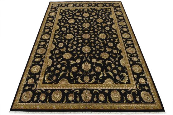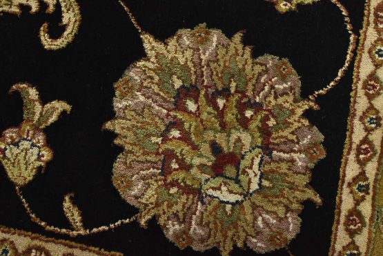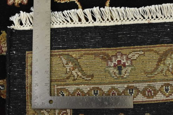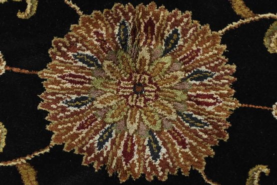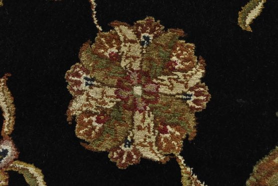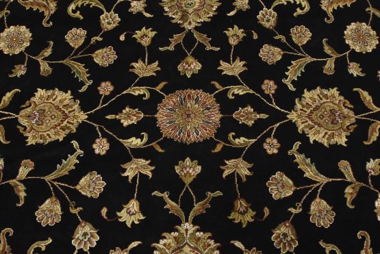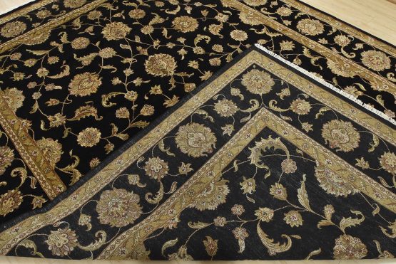 A traditional Agra rug is hand-knotted with a wool and silk pile on a cotton foundation. This finely woven oriental rug features an all-over floral design set against a black background. It is new and in excellent condition.