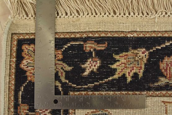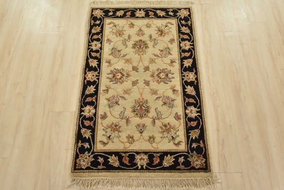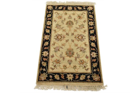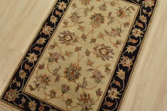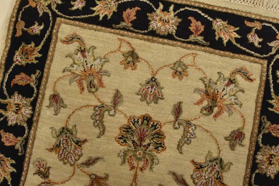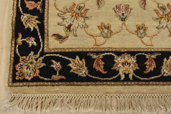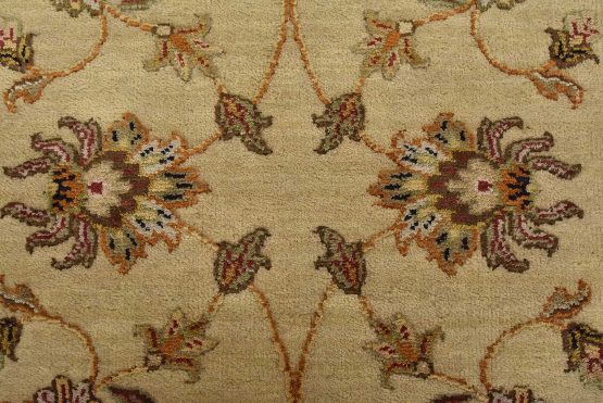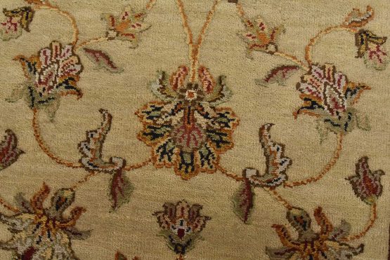 A traditional Agra rug is hand-knotted with a wool and silk pile on a cotton foundation. This finely woven oriental rug features an all-over floral design set against a beige background. It is new and in excellent condition.