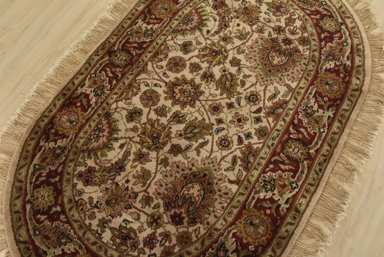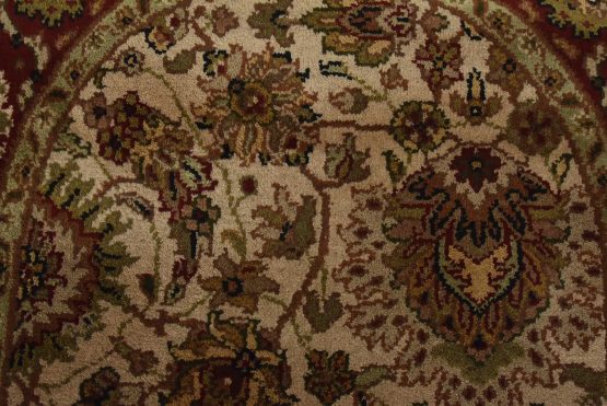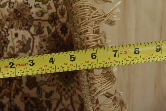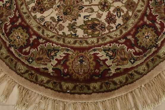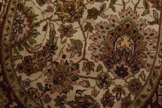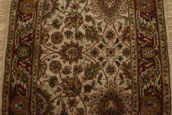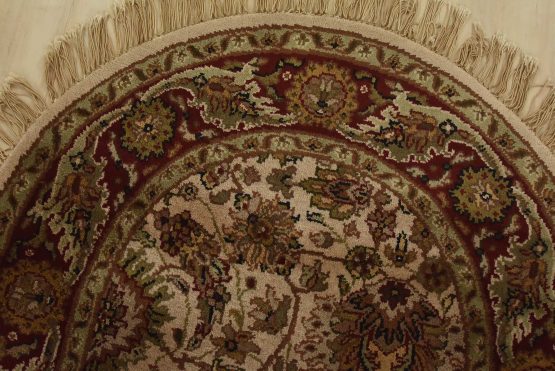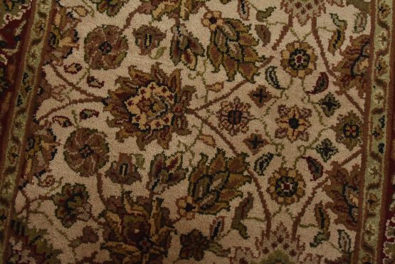 A traditional Agra rug hand-knotted with an all-wool pile on a cotton foundation. This finely woven oriental rug features an all-over floral design set against a beige background. It is new and in excellent condition.