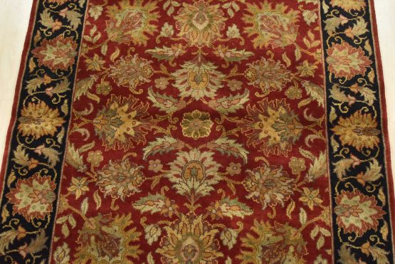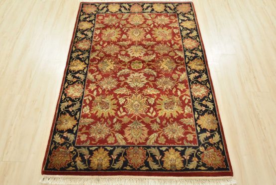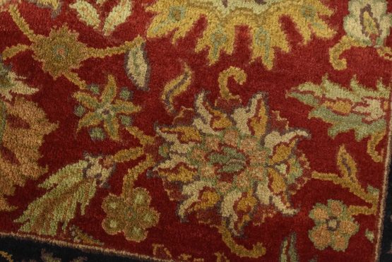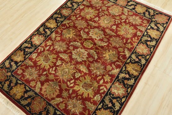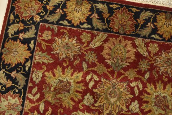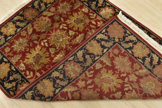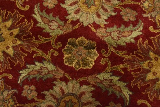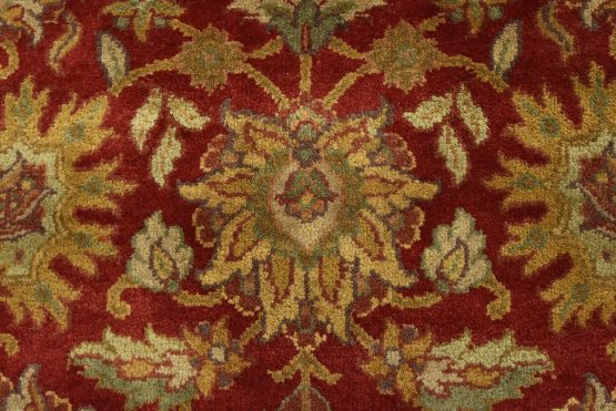 A traditional Agra rug is hand-knotted with an all-wool pile on a cotton foundation. This finely woven oriental rug features an all-over floral pattern set against a red background. It is new and in excellent condition.