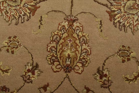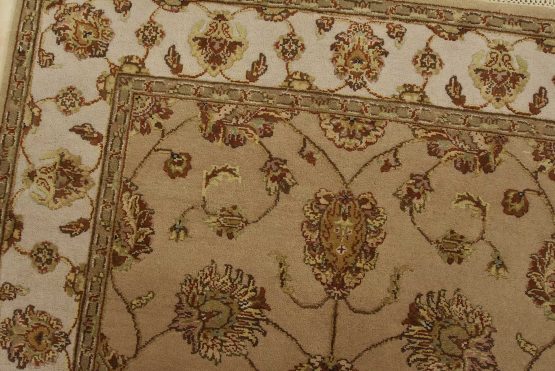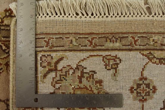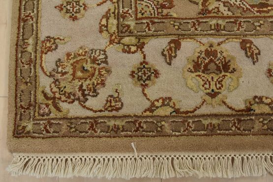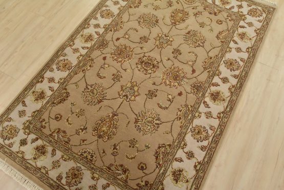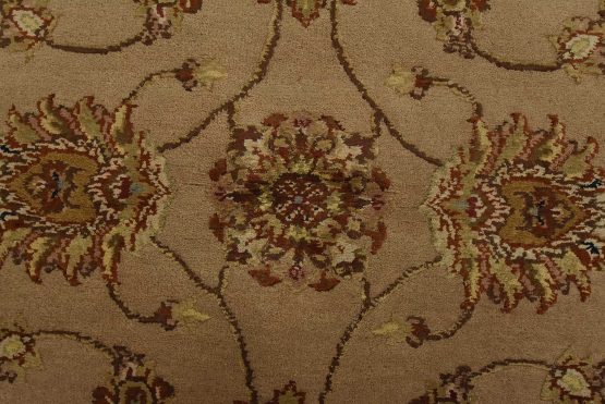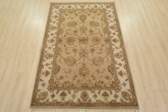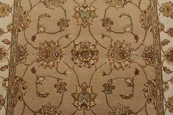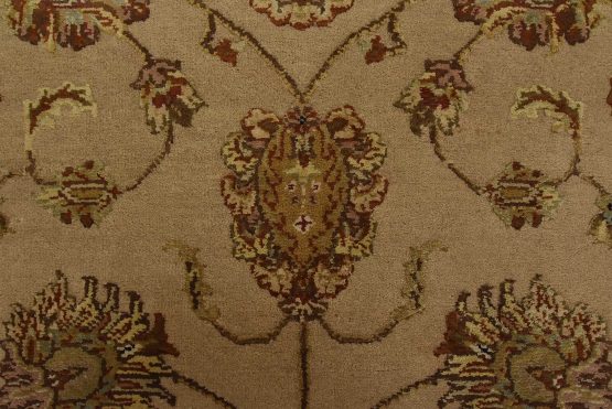 A traditional Agra rug is hand-knotted with a wool and silk pile on a cotton foundation. This finely woven oriental rug features an all-over floral design set against a beige background. It is new and in excellent condition.
