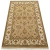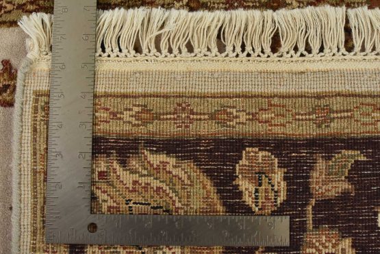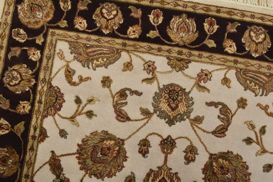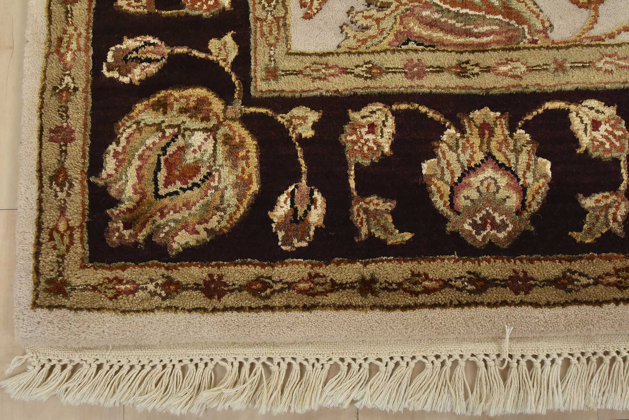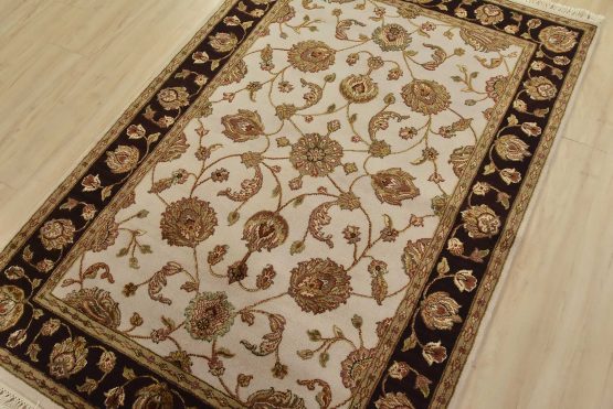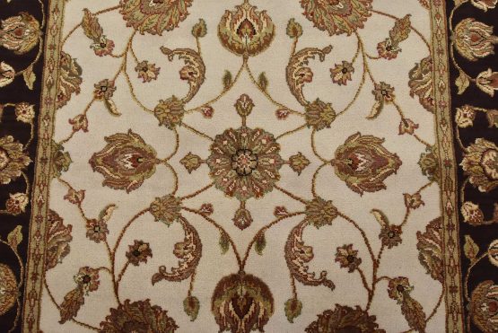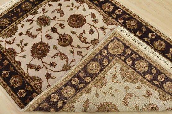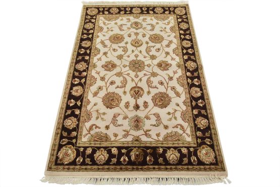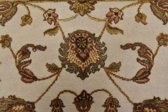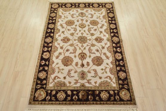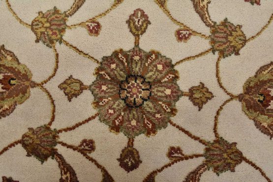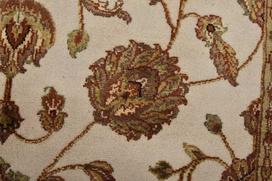 A traditional Agra rug is hand-knotted with a wool and silk pile on a cotton foundation. This finely woven oriental rug features an all-over floral design set against an ivory background. It is new and in excellent condition.
