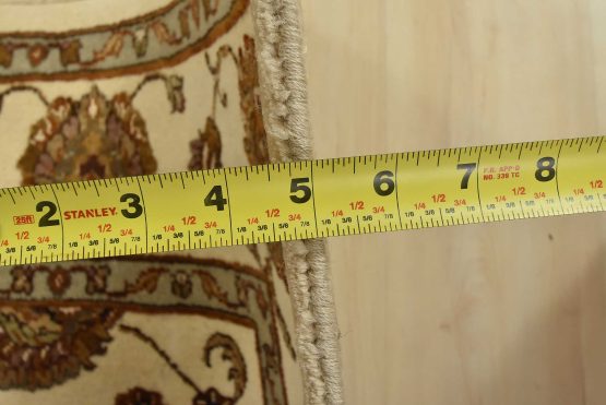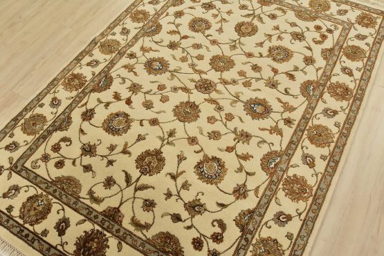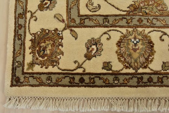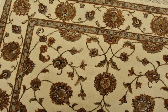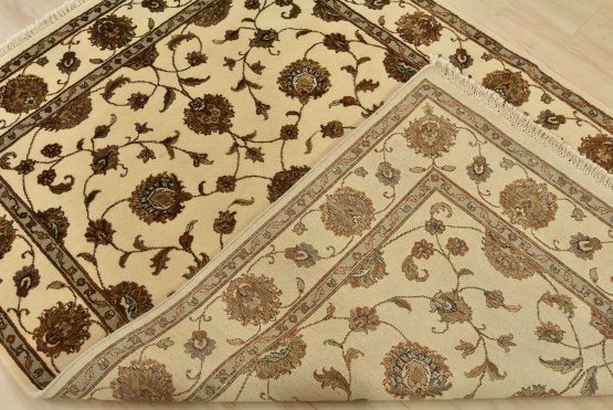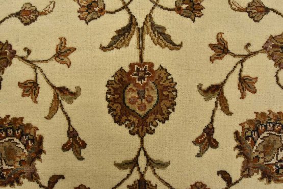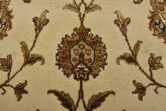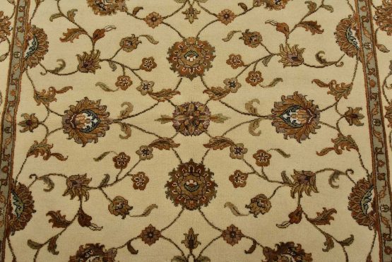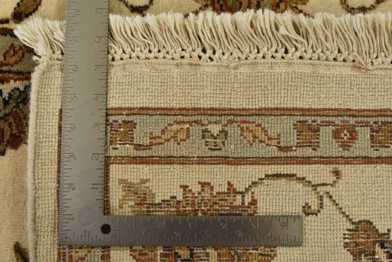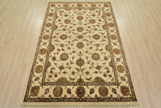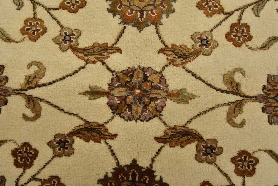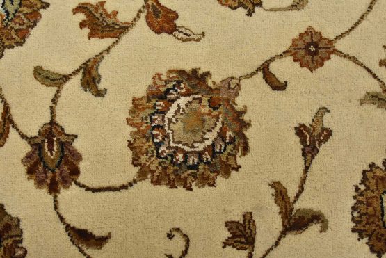 A traditional Agra rug is hand-knotted with a wool and silk pile on a cotton foundation. This finely woven oriental rug features an all-over floral design set against an ivory background. It is new and in excellent condition.