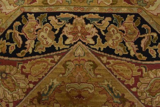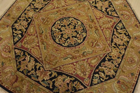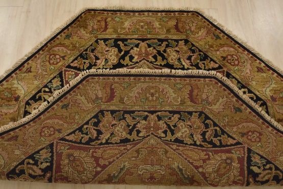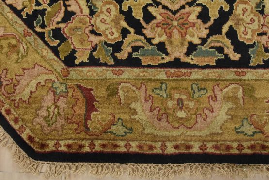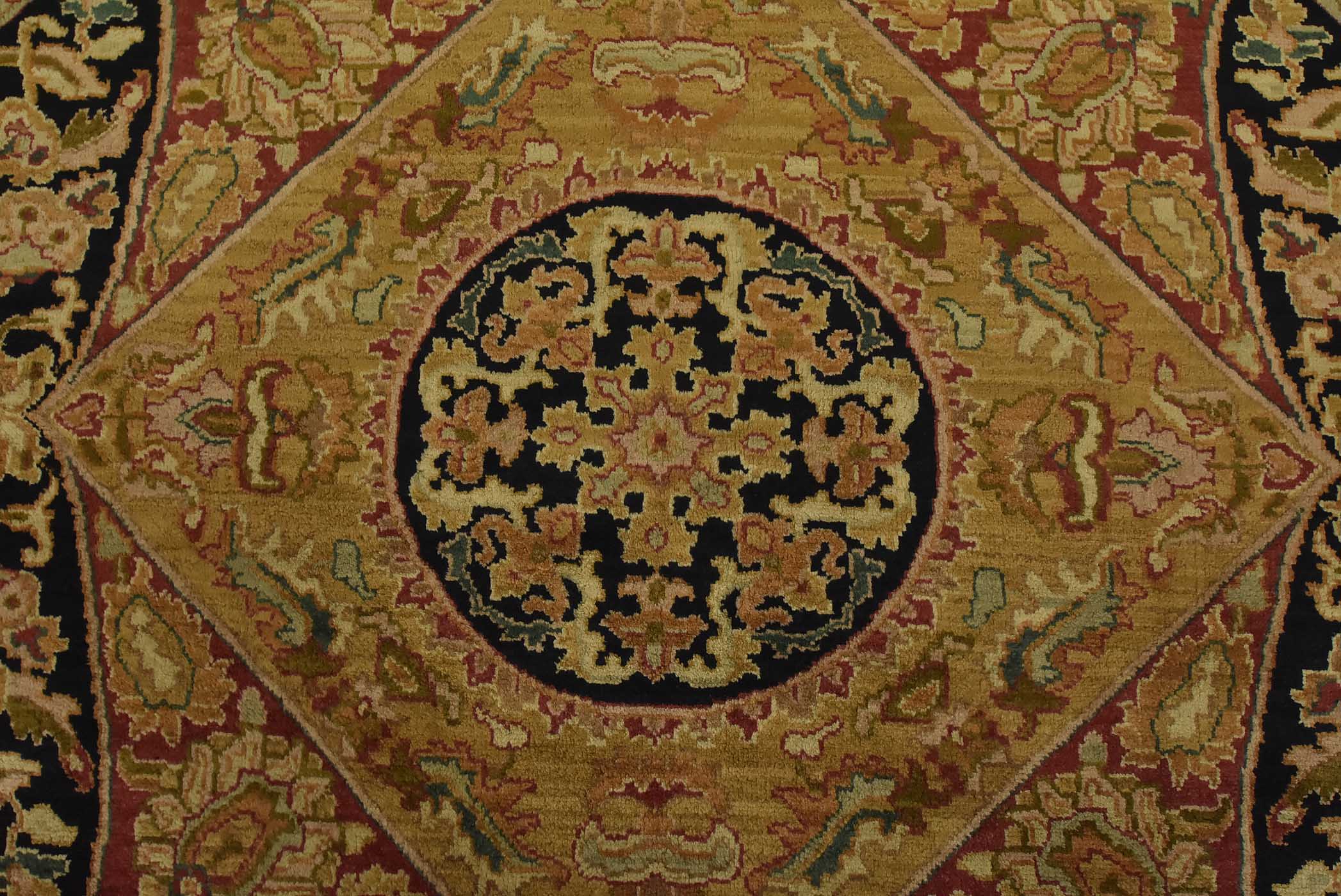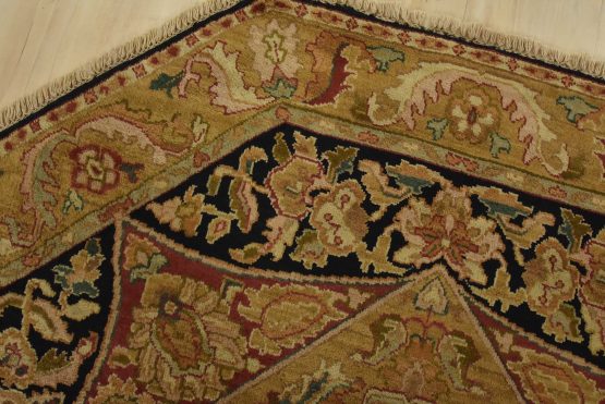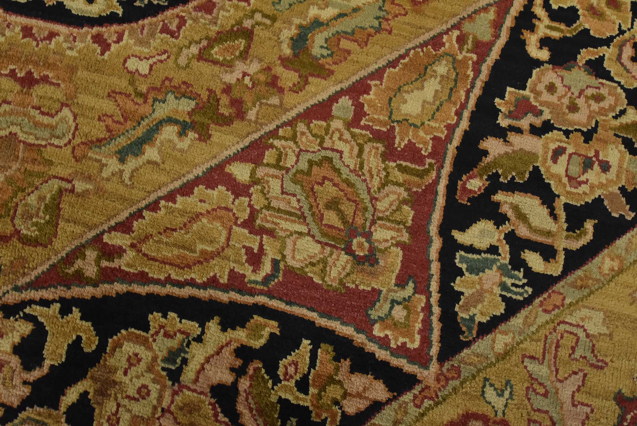 A traditional Agra rug hand-knotted with fine wool on a cotton foundation. This oriental rug features a central medallion surrounded by botanical motifs set against a black background. It is new and in excellent condition.