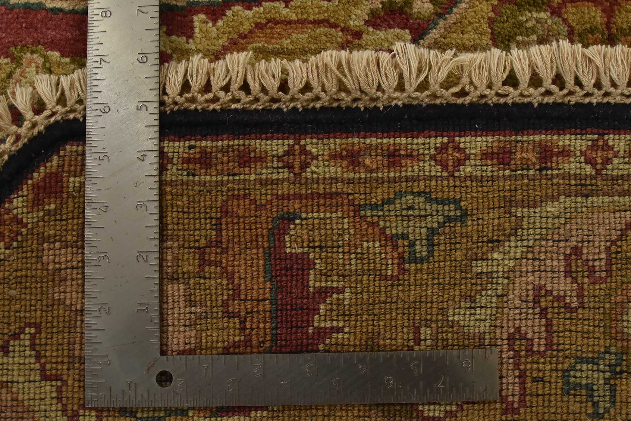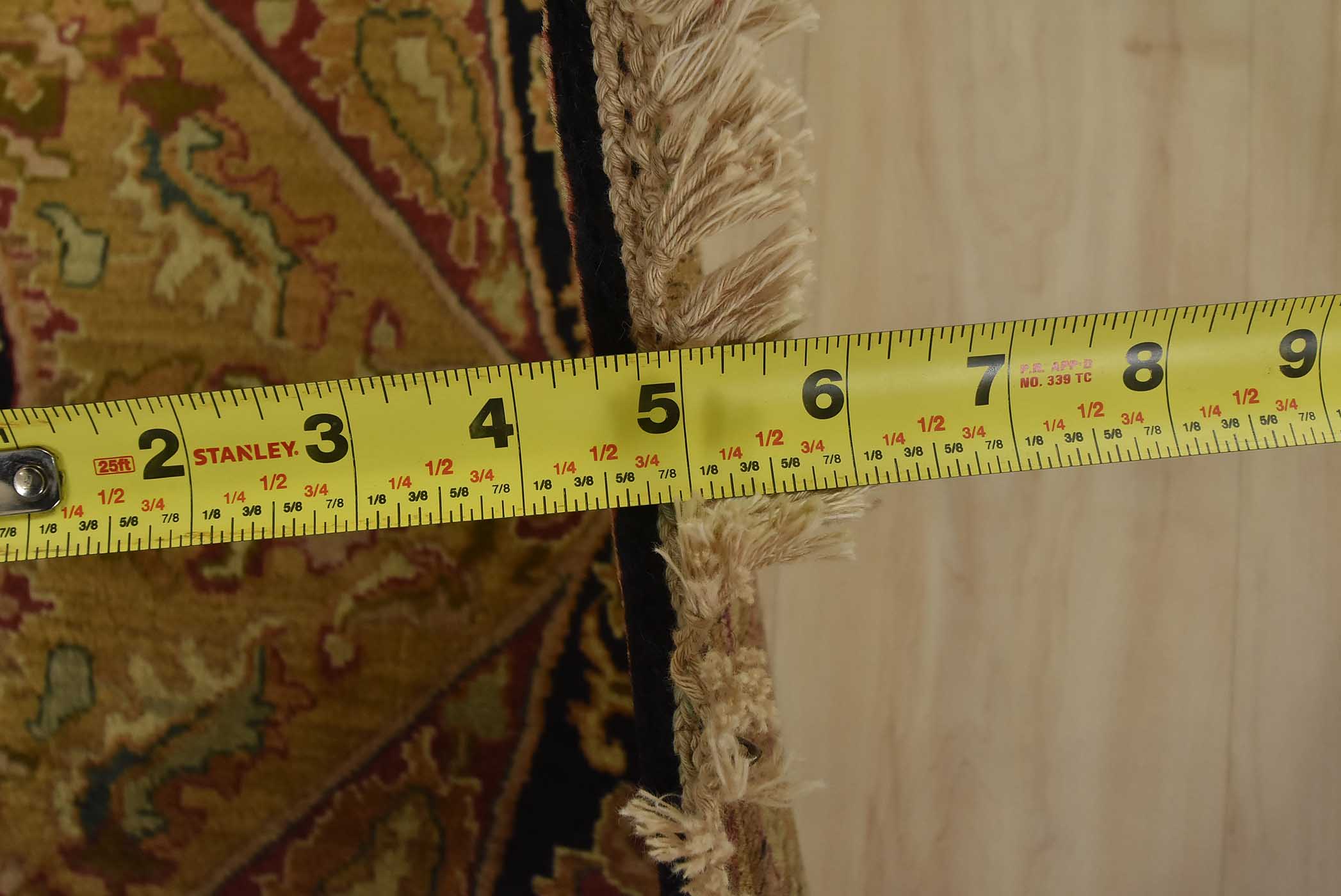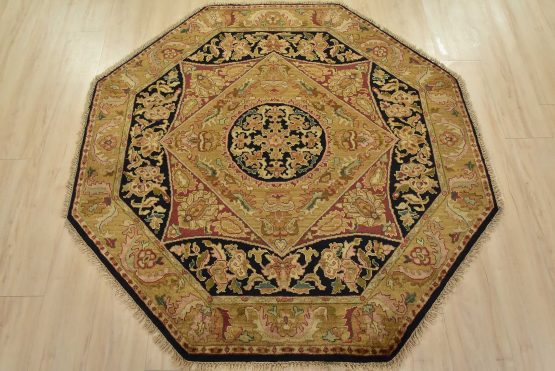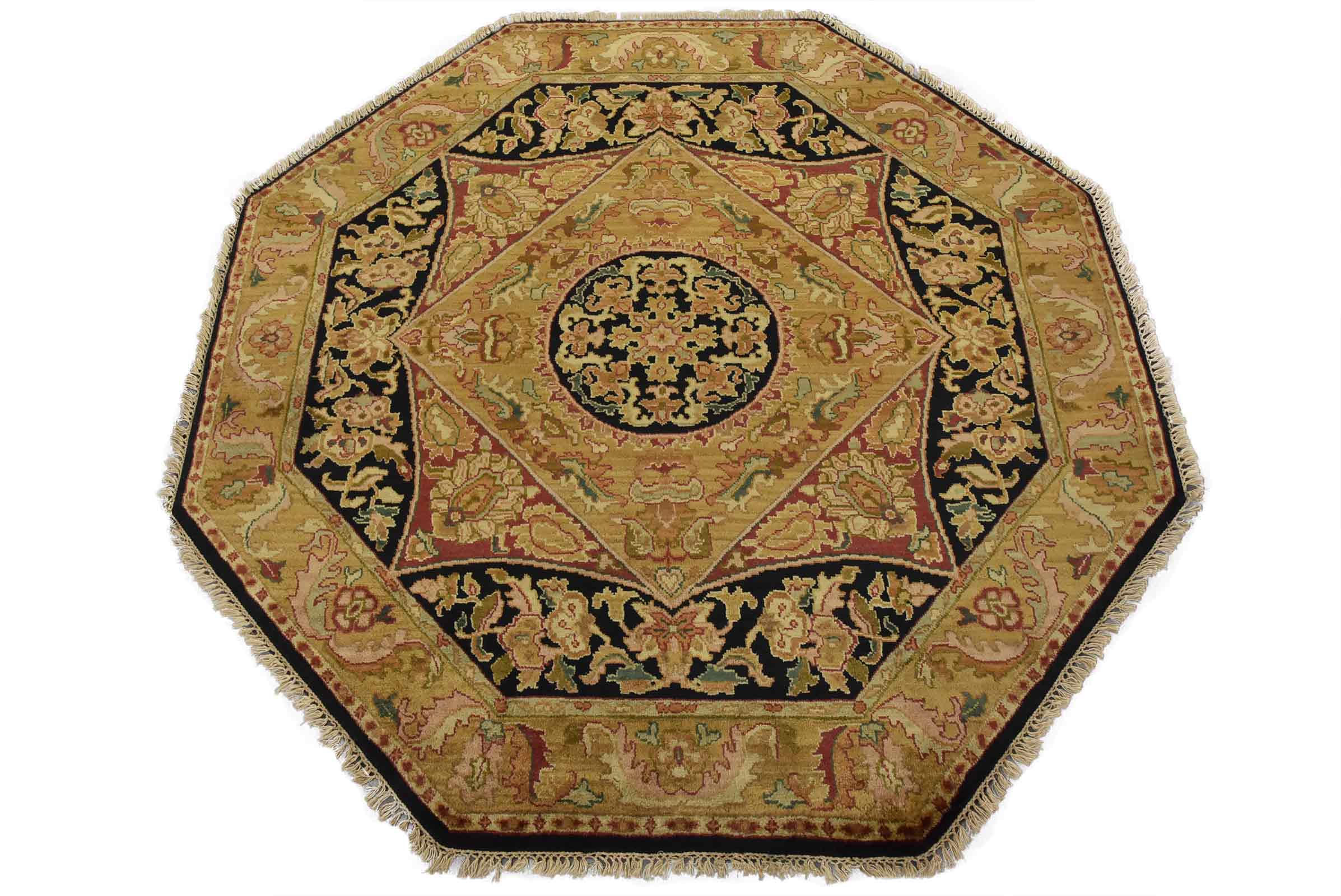 A traditional Agra rug hand-knotted with fine wool on a cotton foundation. This oriental rug features a central medallion surrounded by botanical motifs set against a black background. It is new and in excellent condition.
