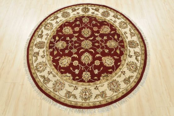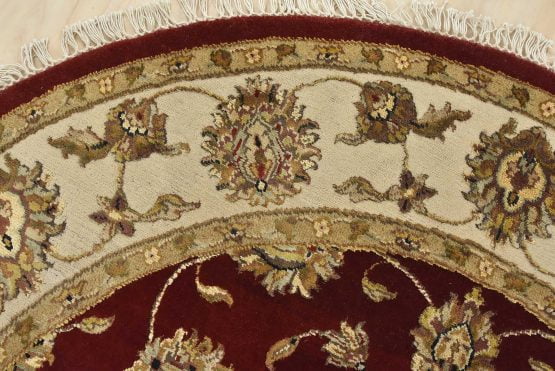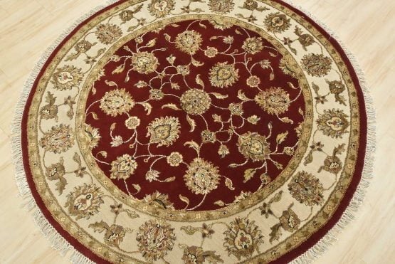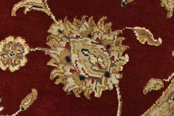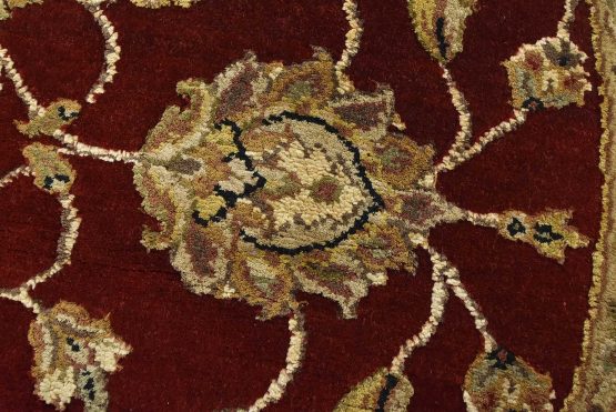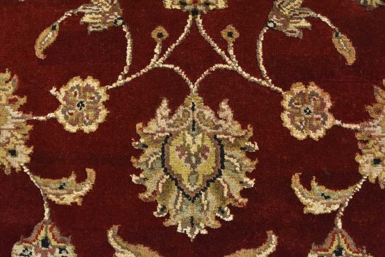 A traditional Agra rug is hand-knotted with a wool and silk pile on a cotton foundation. This finely woven oriental rug features an all-over floral design set against a red background. It is new and in excellent condition.