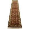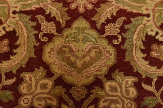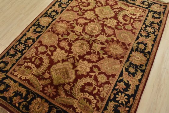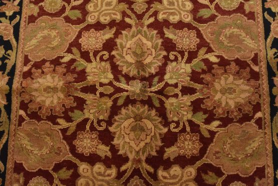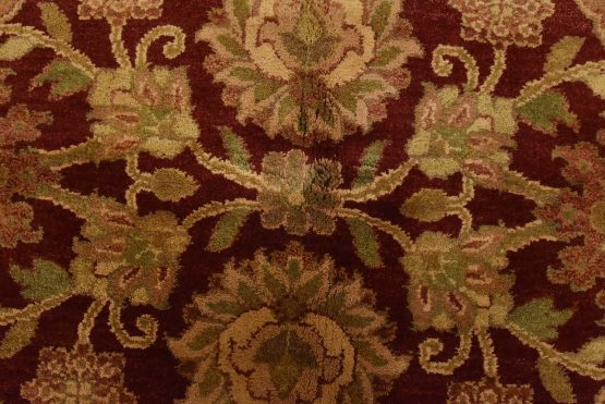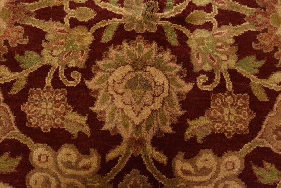A traditional Agra rug is hand-knotted with an all-wool pile on a cotton foundation. This finely woven oriental rug features an all-over floral design set against a red background. It is new and in excellent condition.