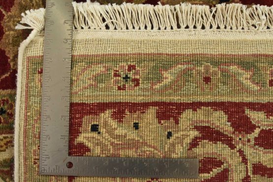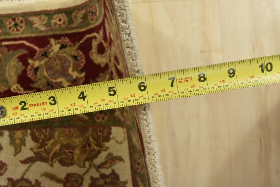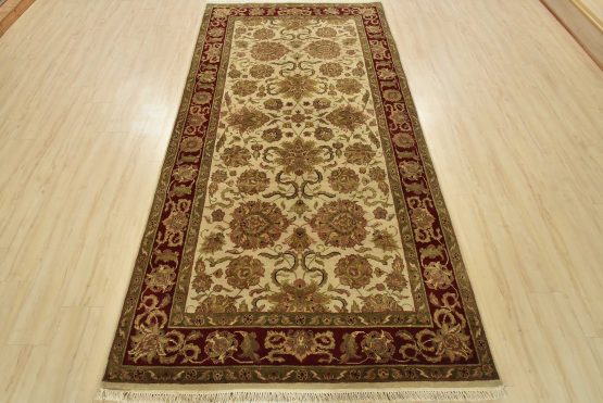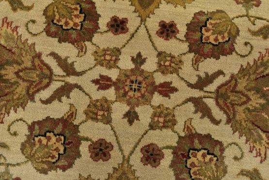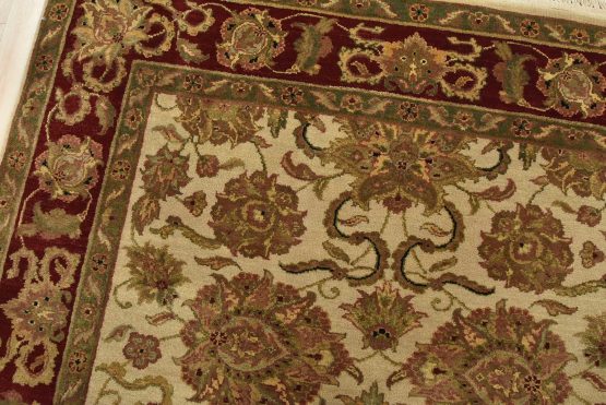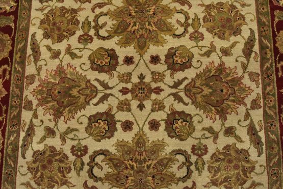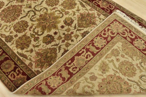 A traditional Agra rug is hand-knotted with an all-wool pile on a cotton foundation. This finely woven oriental rug features an all-over floral design set against an ivory background. It is new and in excellent condition.