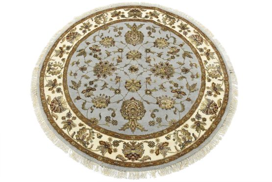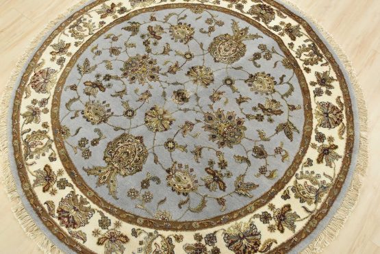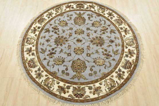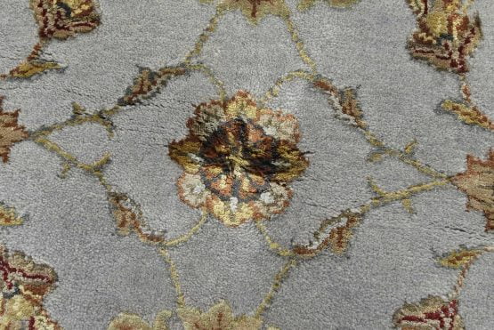 A traditional Agra rug is hand-knotted with a wool and silk pile on a cotton foundation. This finely woven oriental rug features an all-over floral design set against a light blue background. It is new and in excellent condition.