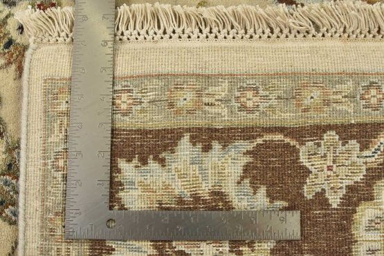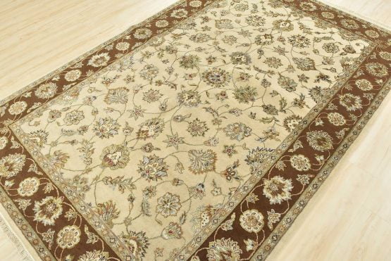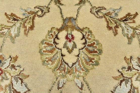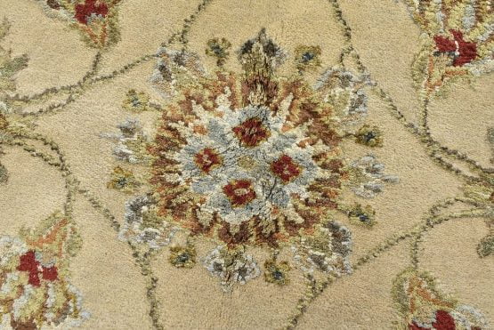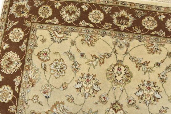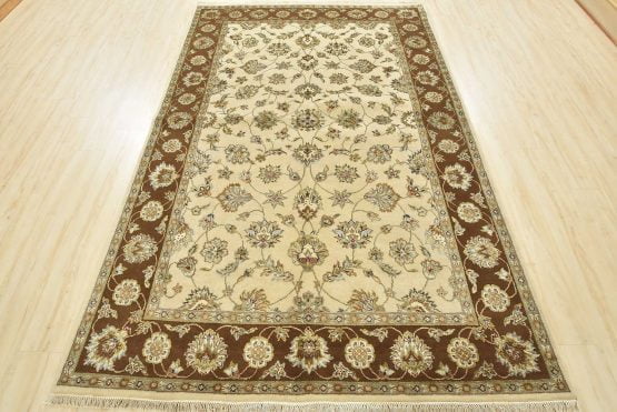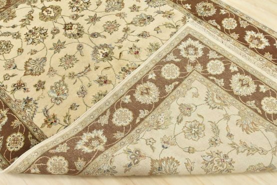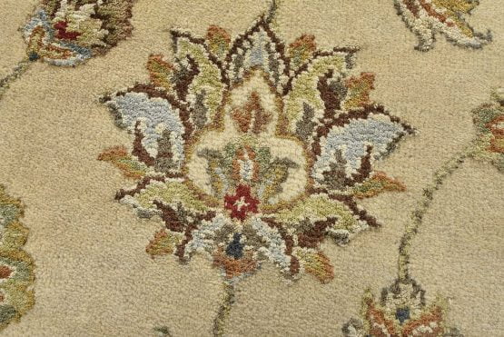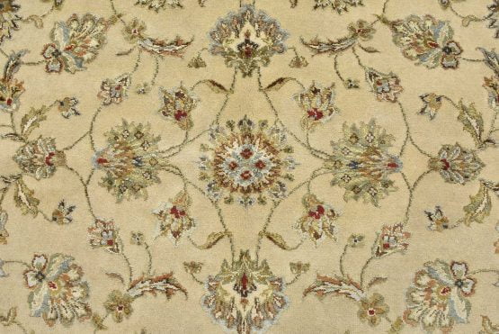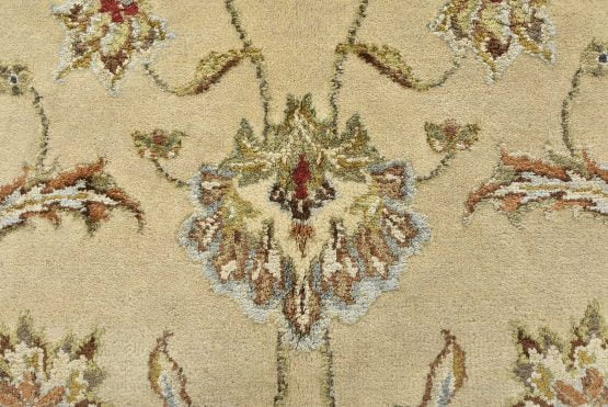 A traditional Agra rug is hand-knotted with a wool and silk pile on a cotton foundation. This finely woven oriental rug features an all-over floral design set against an ivory-colored background. It is new and in excellent condition.