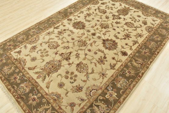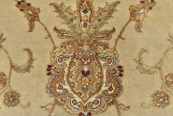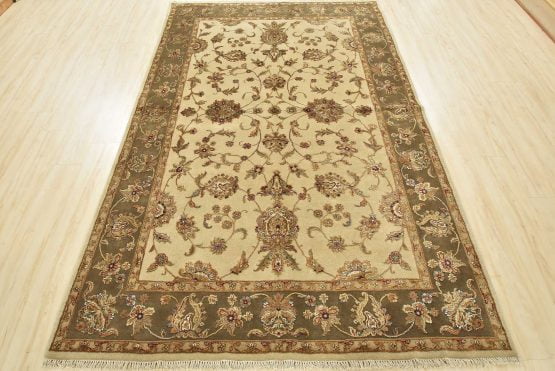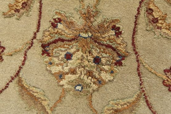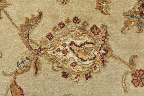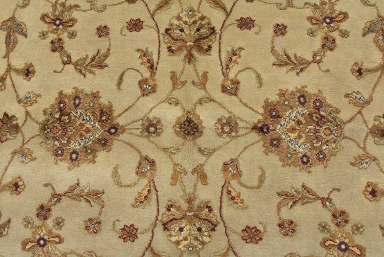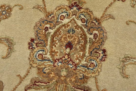 A traditional Agra rug is hand-knotted with a wool and silk pile on a cotton foundation. This finely woven oriental rug features an all-over floral design set against a cream-colored background. It is new and in excellent condition.
