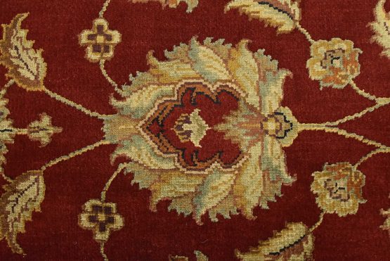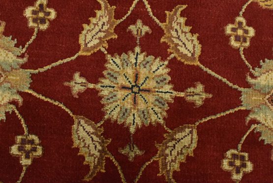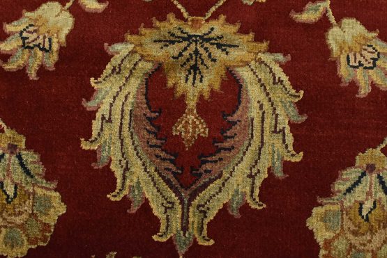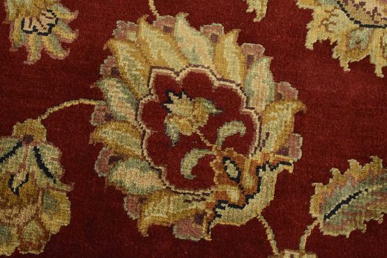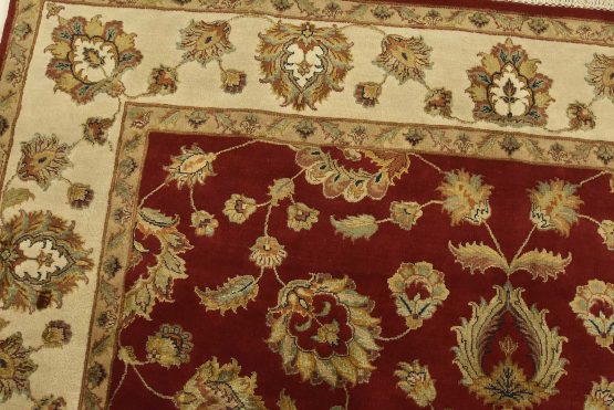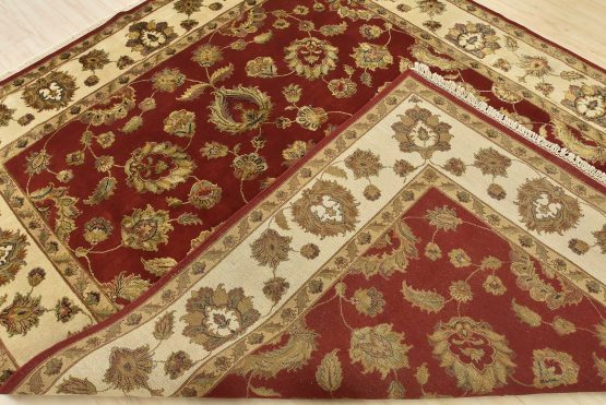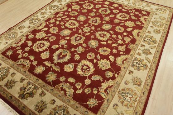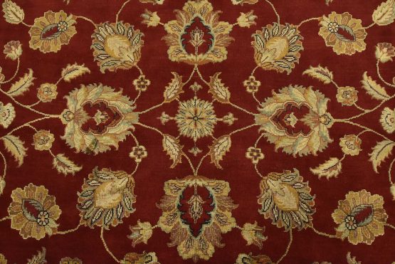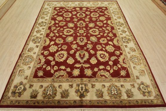 A traditional Agra rug is hand-knotted with a wool and silk pile on a cotton foundation. This finely woven oriental rug features an all-over floral design set against a red background. It is new and in excellent condition.