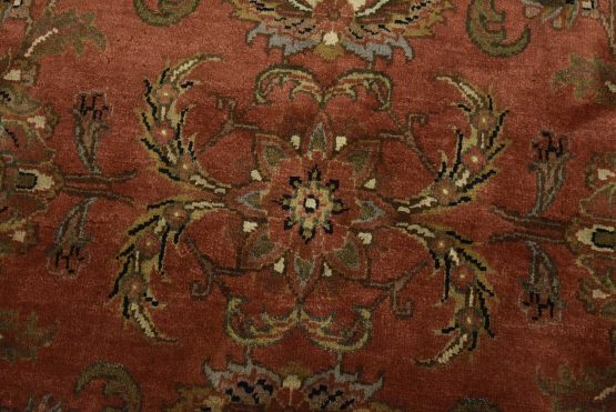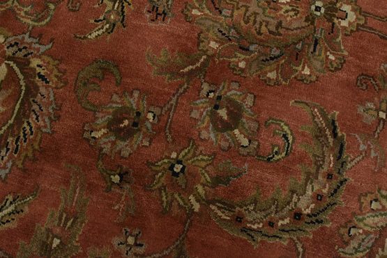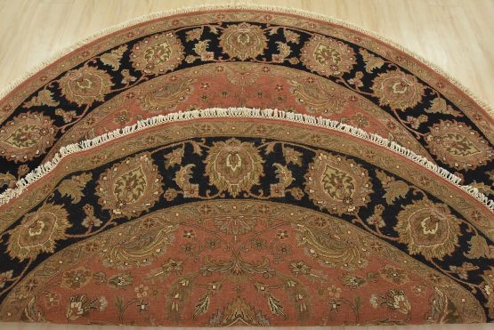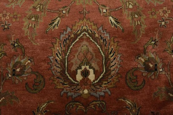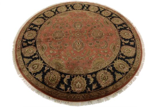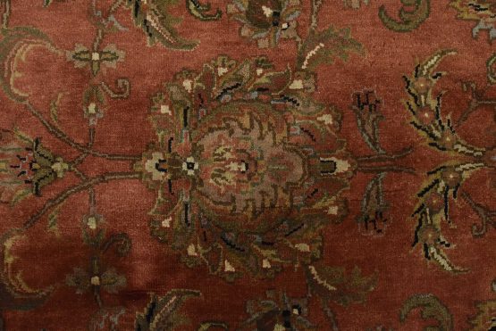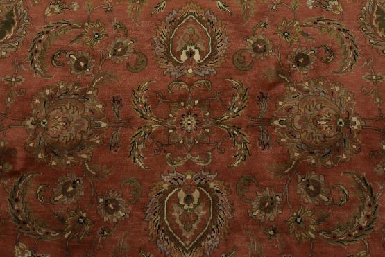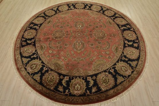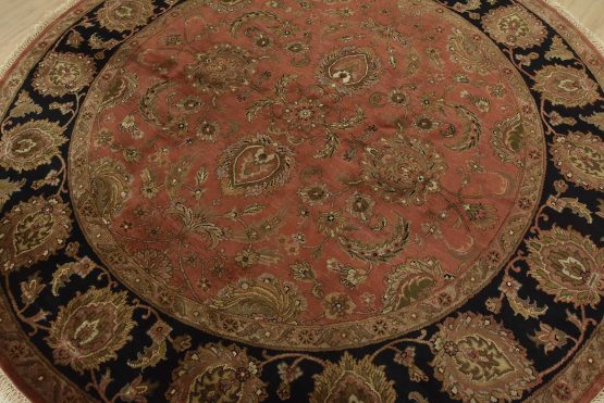A traditional Agra rug hand-knotted with an all-wool pile on a cotton foundation. This finely woven oriental rug features an all-over floral design set against a pink background. It is new and in excellent condition.