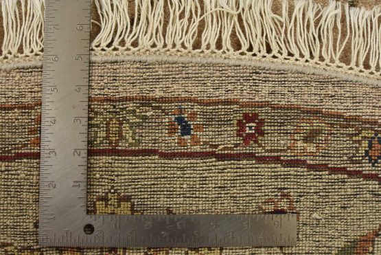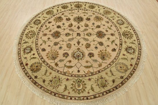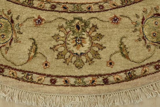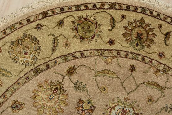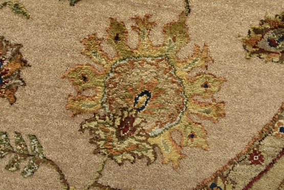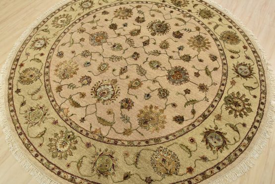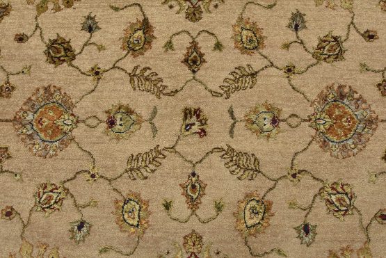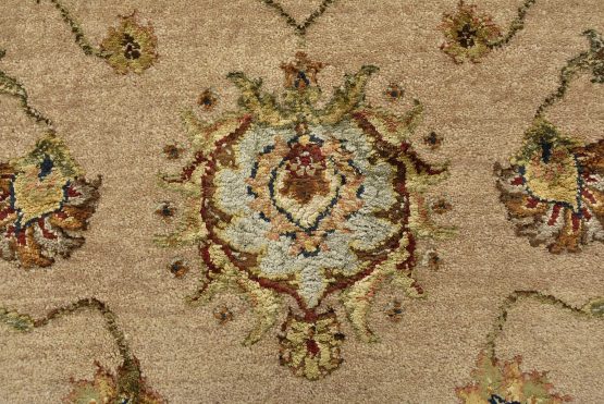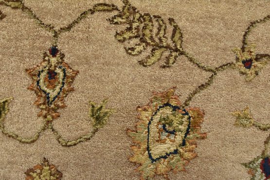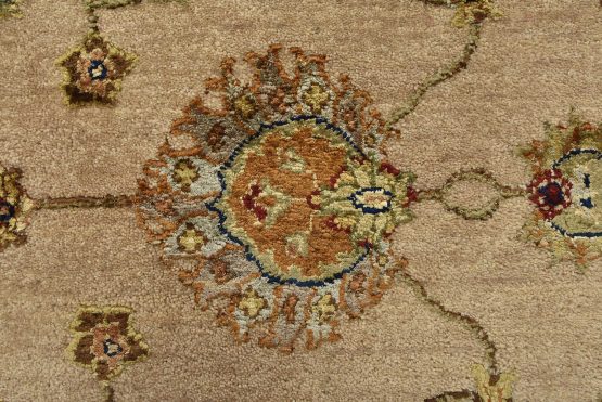 A traditional Agra rug is hand-knotted with a wool and silk pile on a cotton foundation. This finely woven oriental rug features an all-over floral design set against a beige background. It is new and in excellent condition.