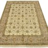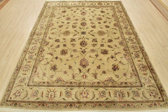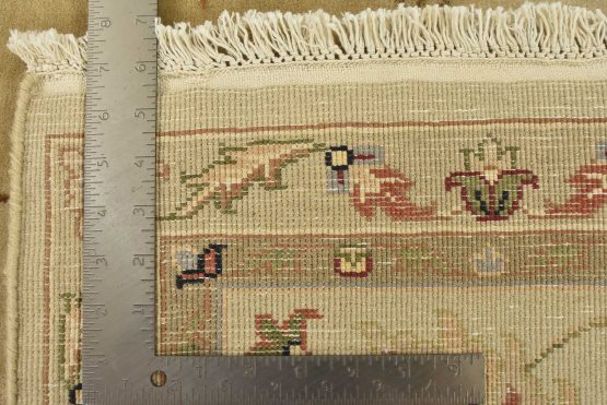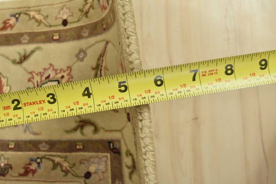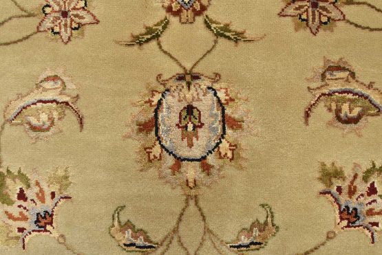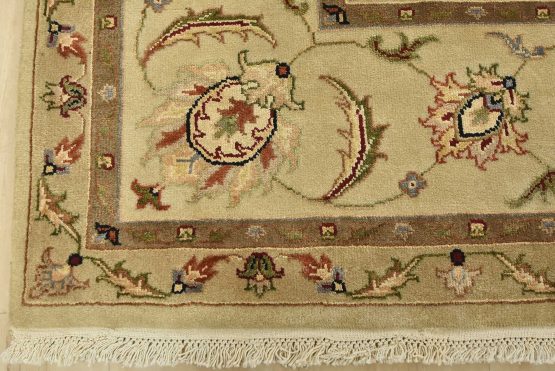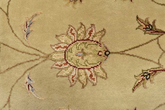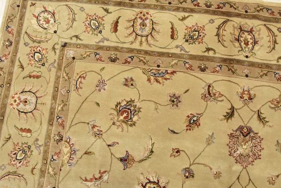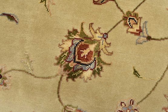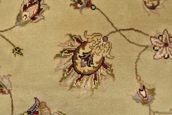 A traditional Agra rug is hand-knotted with a wool and silk pile on a cotton foundation. This finely woven oriental rug features an all-over floral design set against a beige background. It is new and in excellent condition.