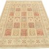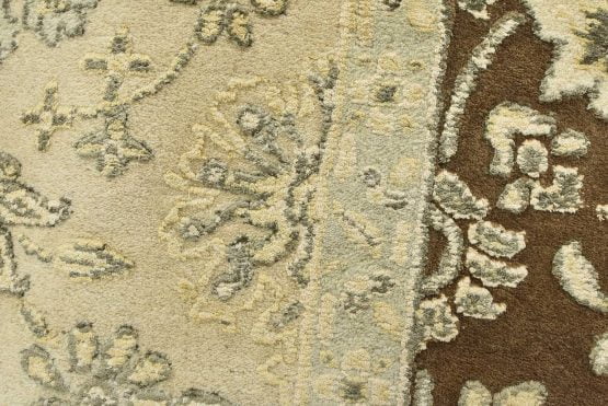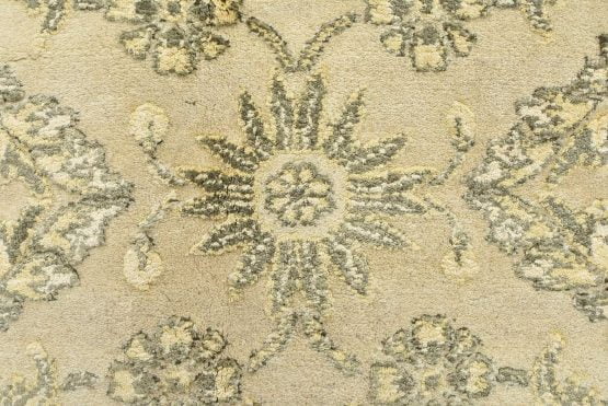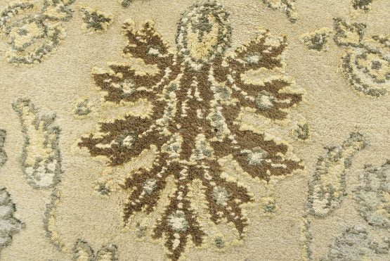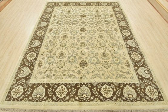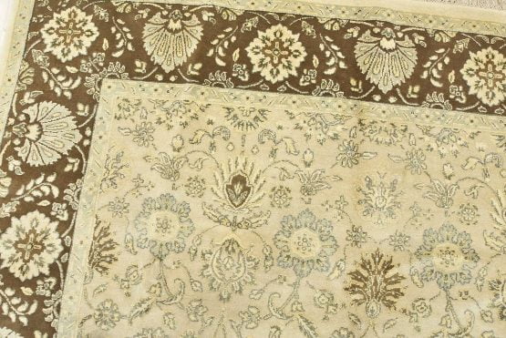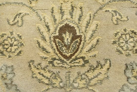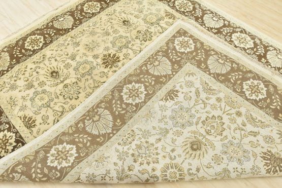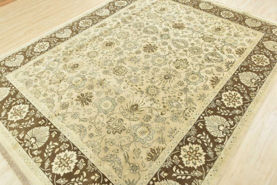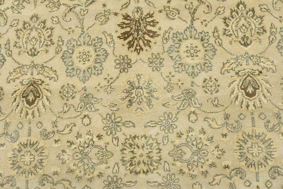 A traditional Agra rug is hand-knotted with a wool and silk pile on a cotton foundation. This finely woven oriental rug features an all-over floral design set against an ivory-colored background. It is new and in excellent condition.