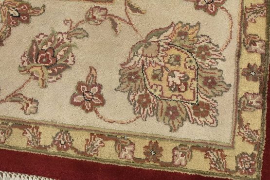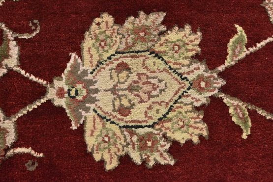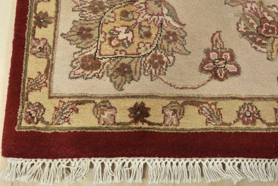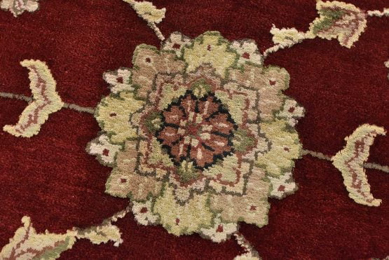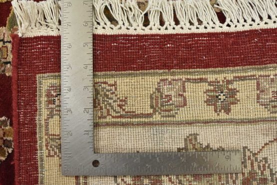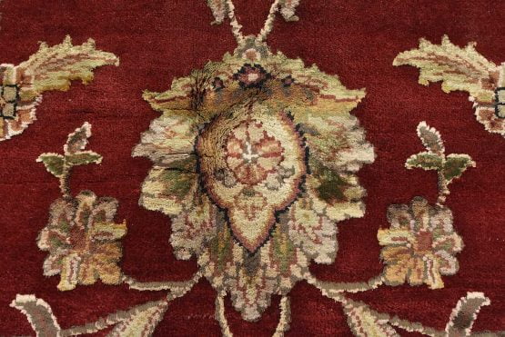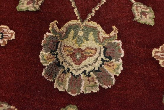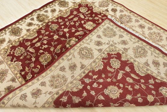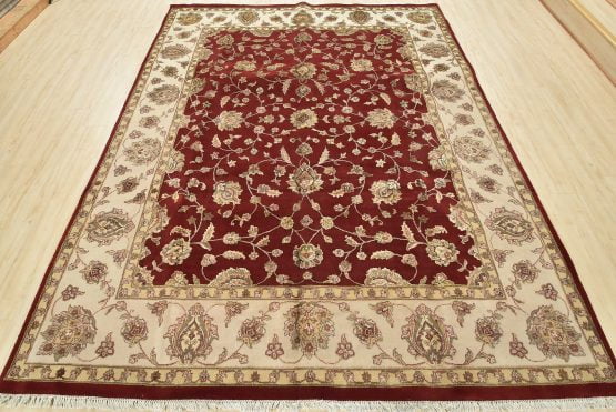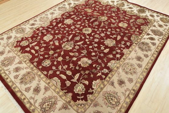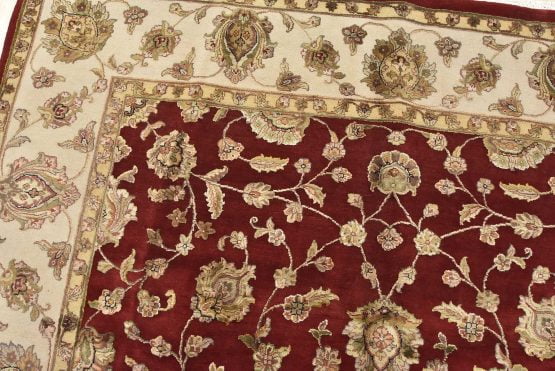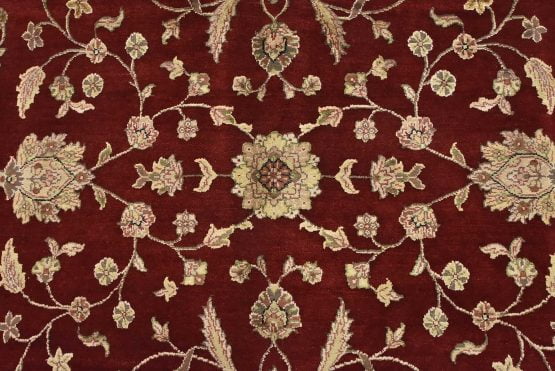 A traditional Agra rug is hand-knotted with a wool and silk pile on a cotton foundation. This finely woven oriental rug features an all-over floral design set against a red background. It is new and in excellent condition.
