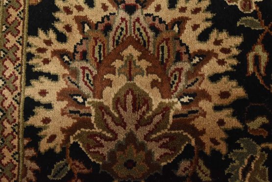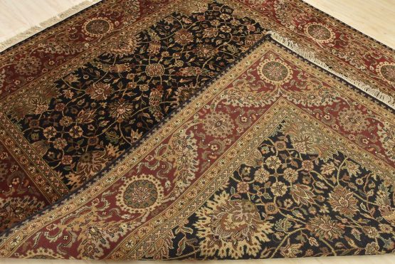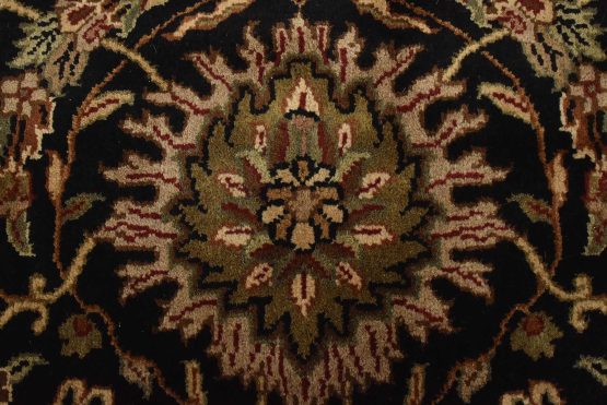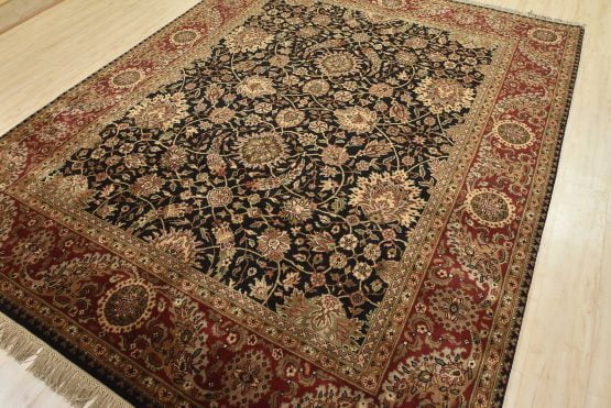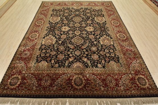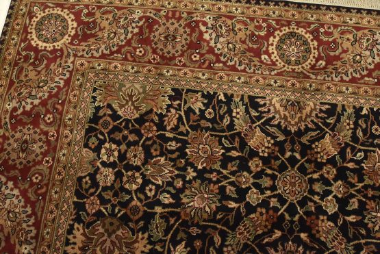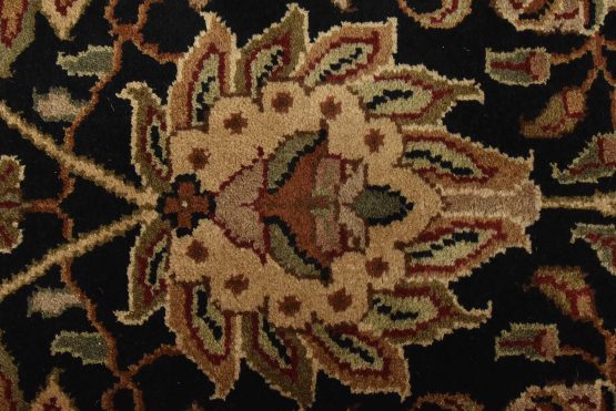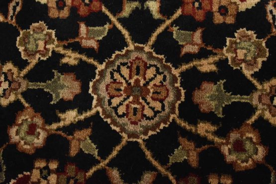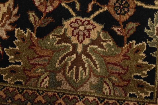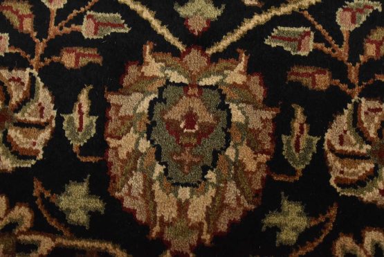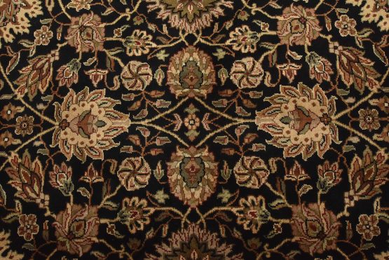 A traditional Agra rug is hand-knotted with an all-wool pile on a cotton foundation. This finely woven oriental rug features an all-over floral design set against a black background. It is new and in excellent condition.