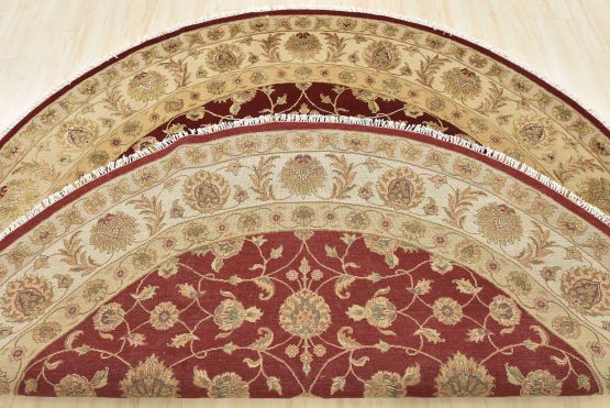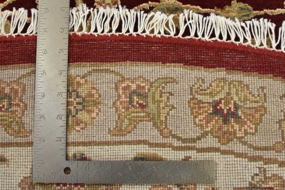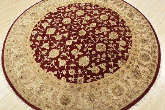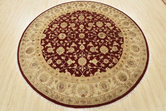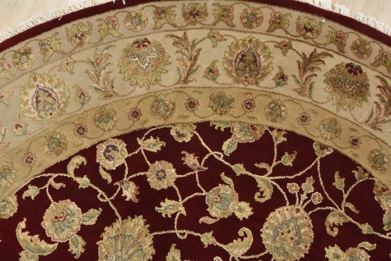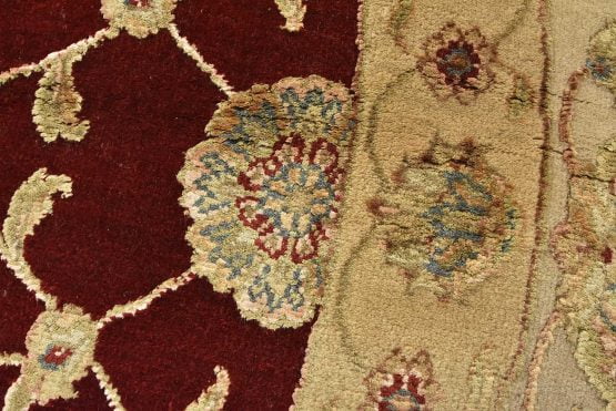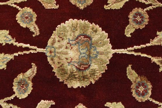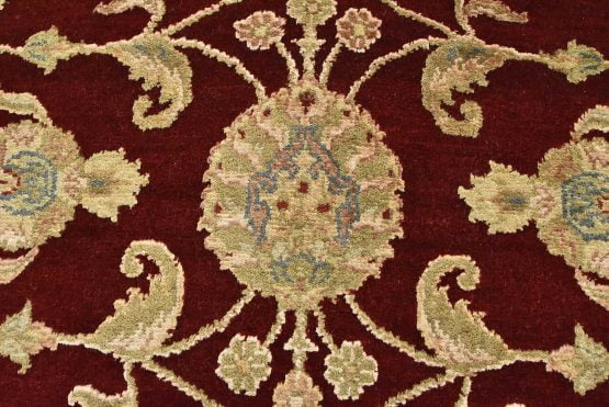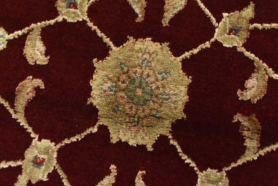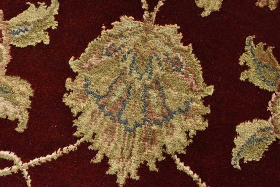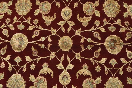 A traditional Agra rug is hand-knotted with a wool and silk pile on a cotton foundation. This finely woven oriental rug features an all-over floral design set against a dark red background. It is new and in excellent condition.