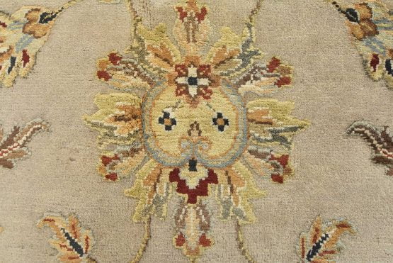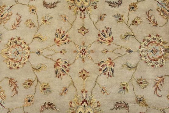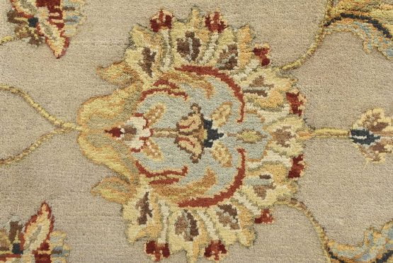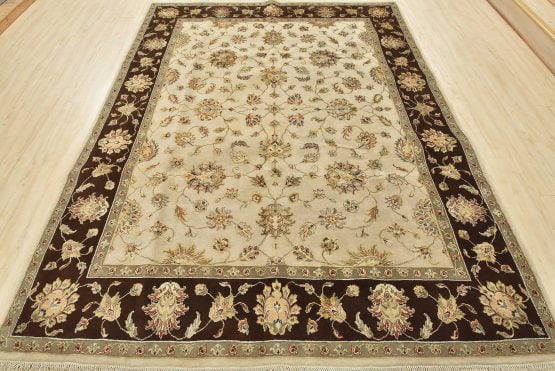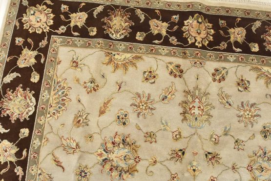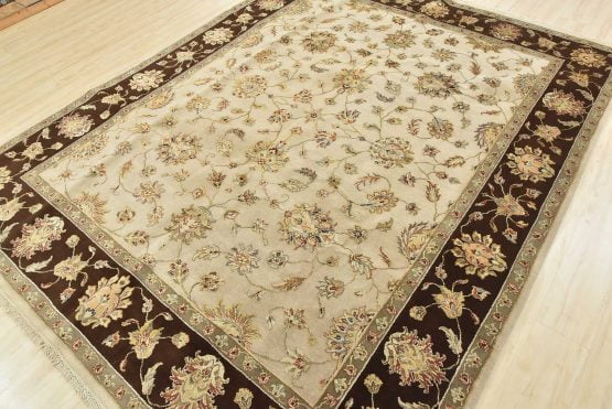 A traditional Agra rug is hand-knotted with a wool and silk pile on a cotton foundation. This finely woven oriental rug features an all-over floral design set against a cream-colored background. It is new and in excellent condition.