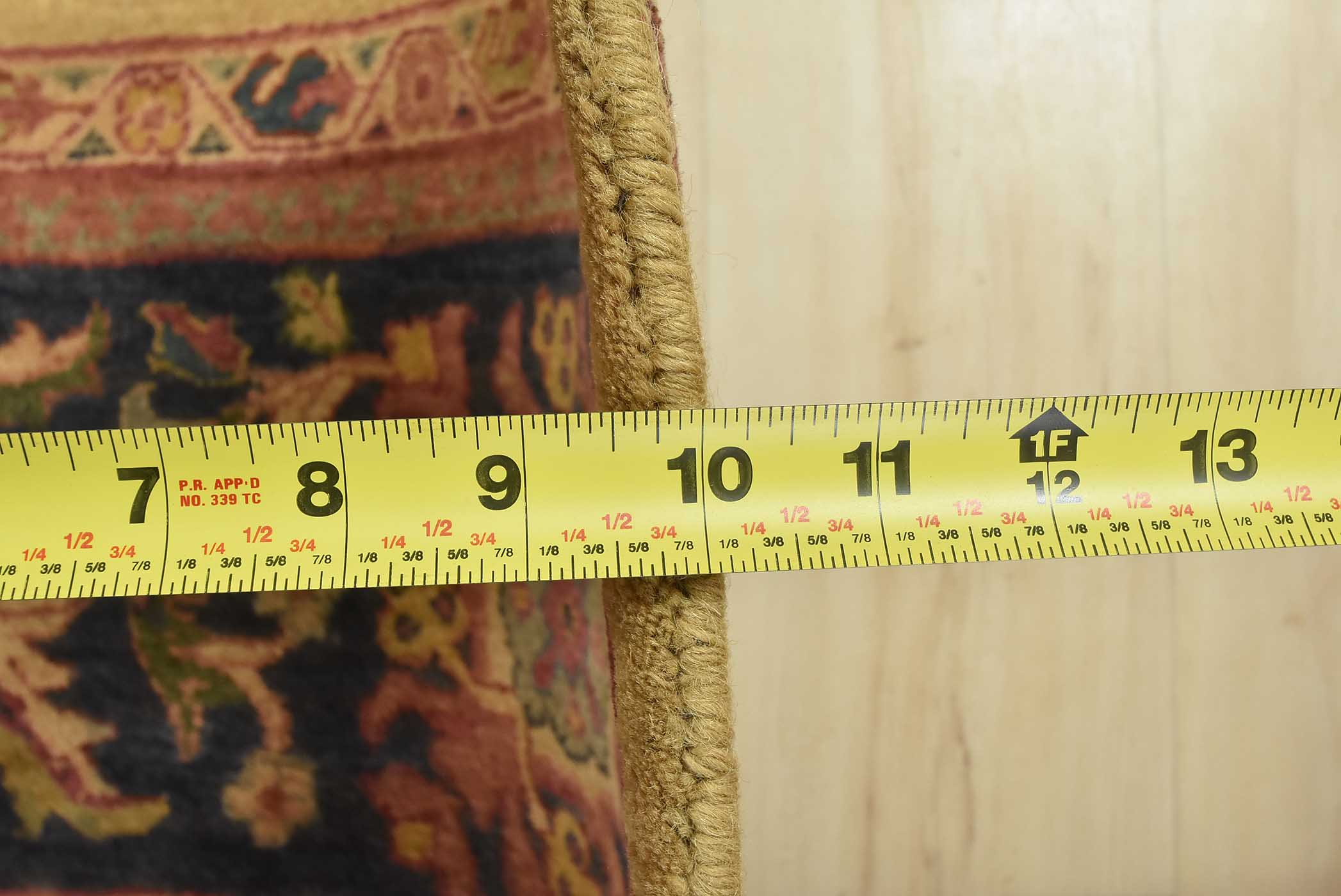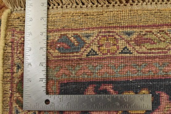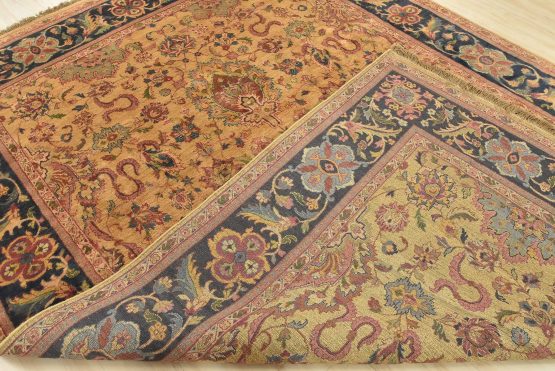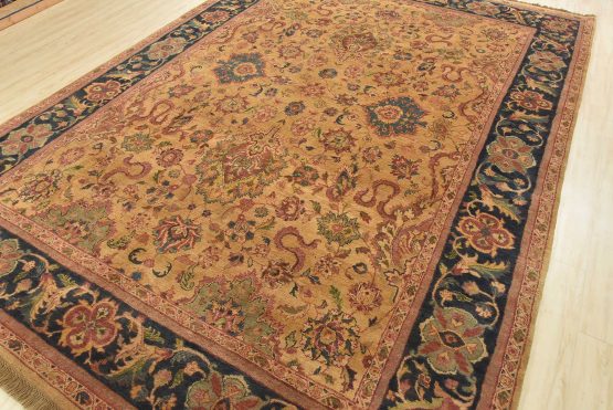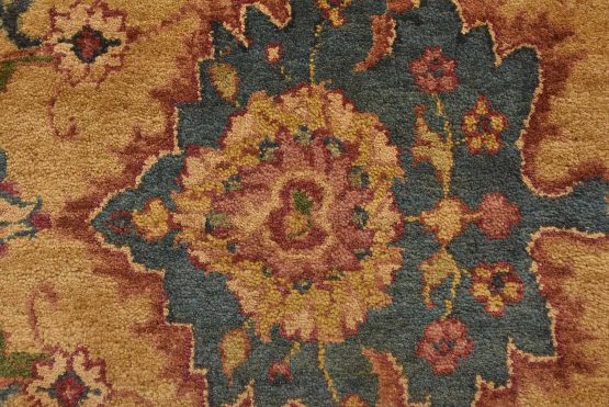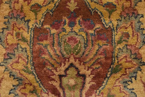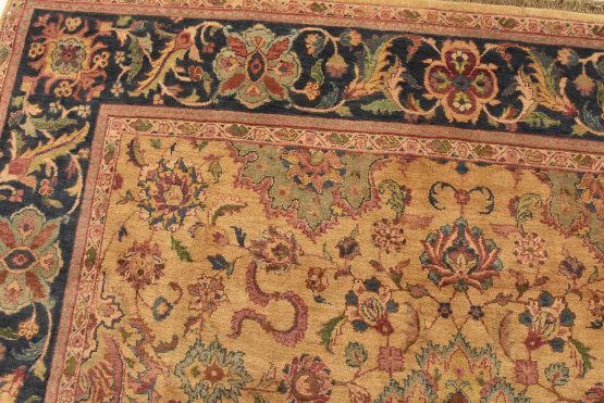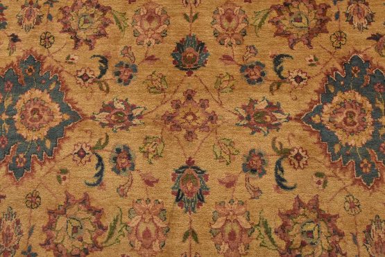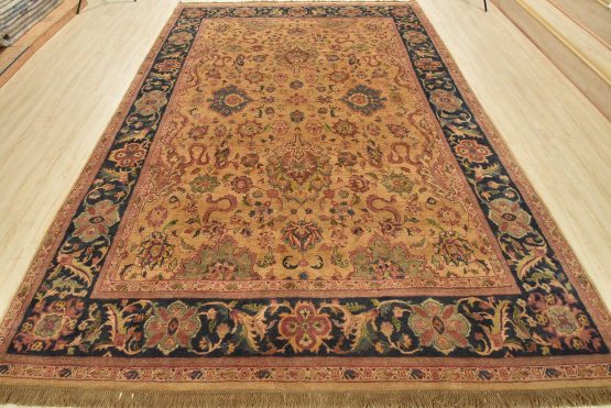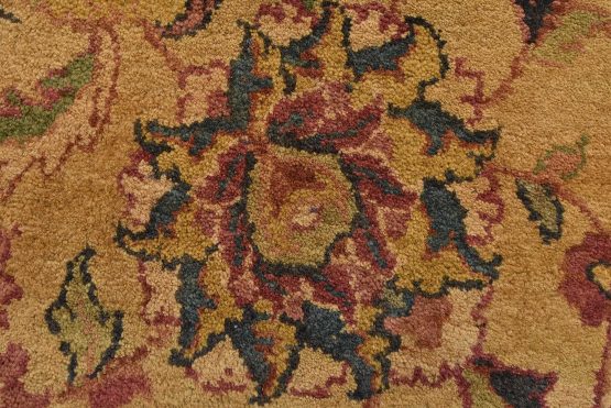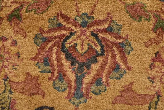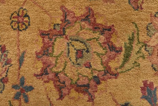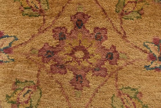 A traditional Agra rug is hand-knotted with an all-wool pile on a cotton foundation. This finely woven oriental rug features an all-over floral design set against a gold background. It is new and in excellent condition.