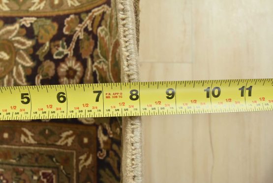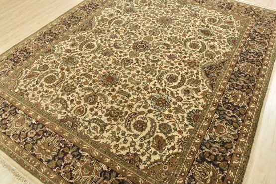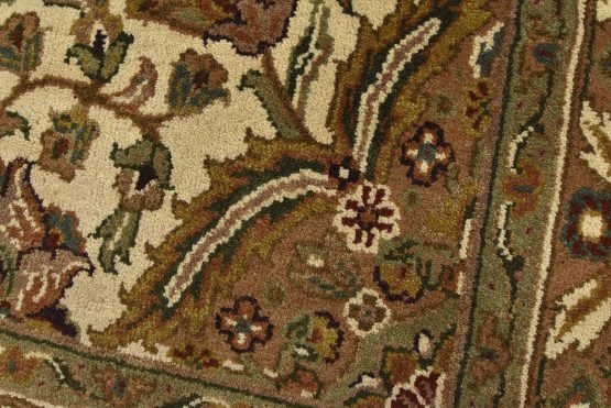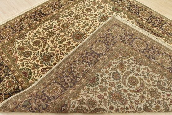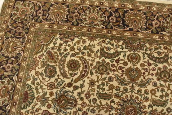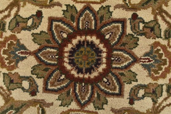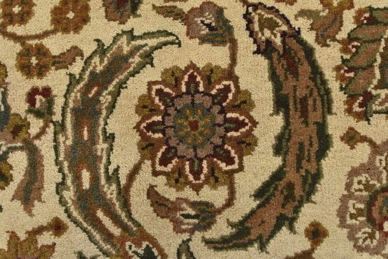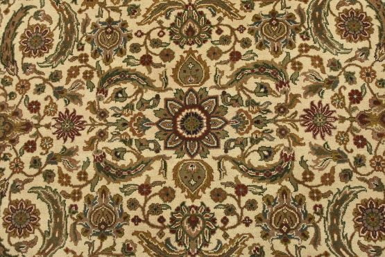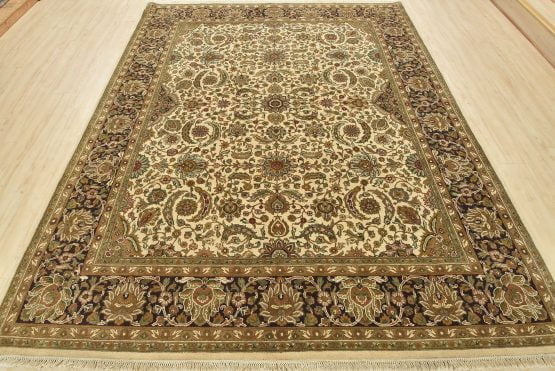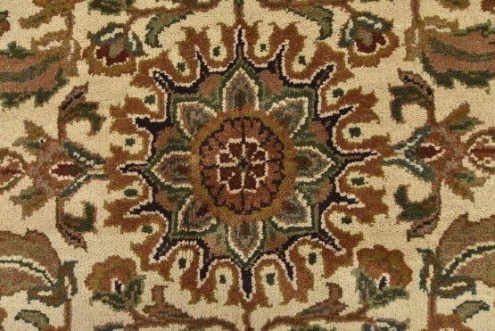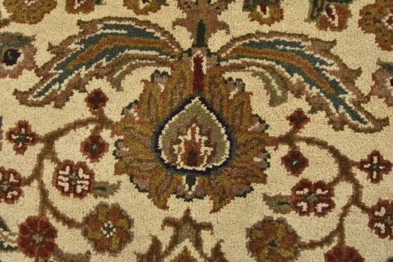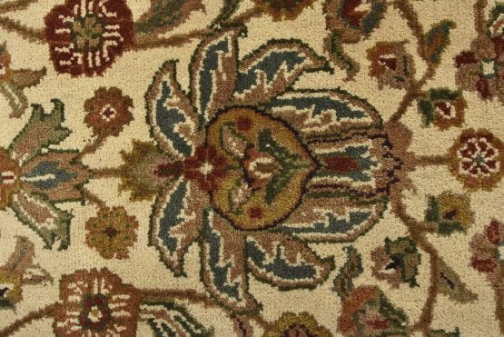 A traditional Agra rug is hand-knotted with an all-wool pile on a cotton foundation. This finely woven oriental rug features an all-over floral design set against an ivory background. It is new and in excellent condition.
