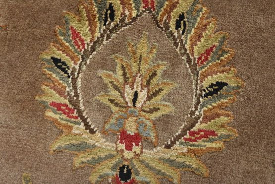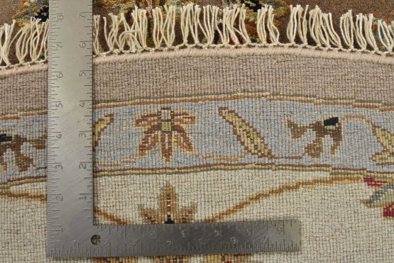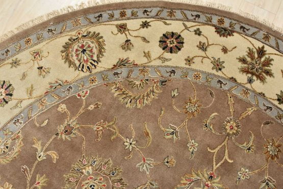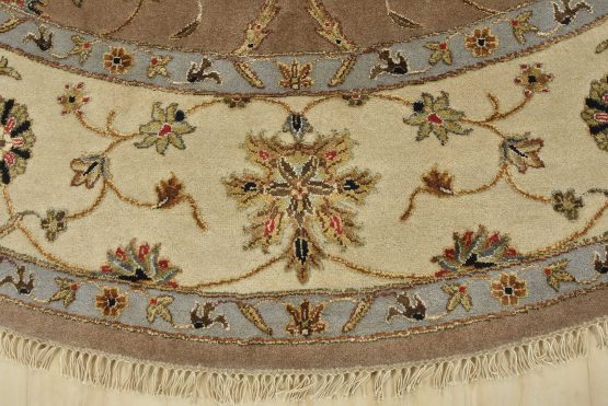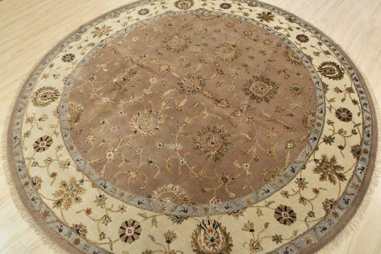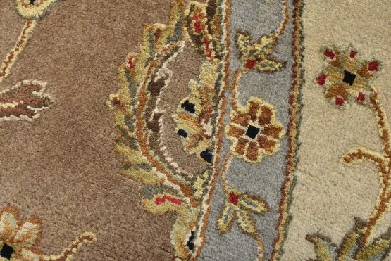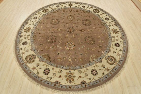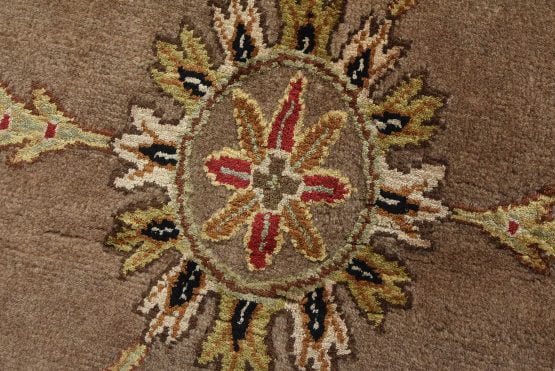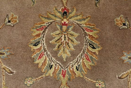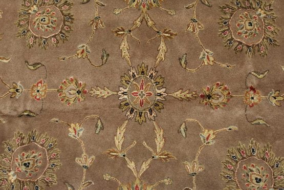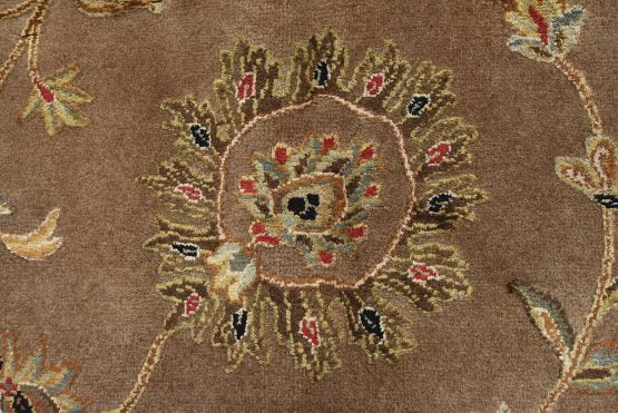 A traditional Agra rug is hand-knotted with a wool and silk pile on a cotton foundation. This finely woven oriental rug features an all-over floral design set against a brown background. It is new and in excellent condition.