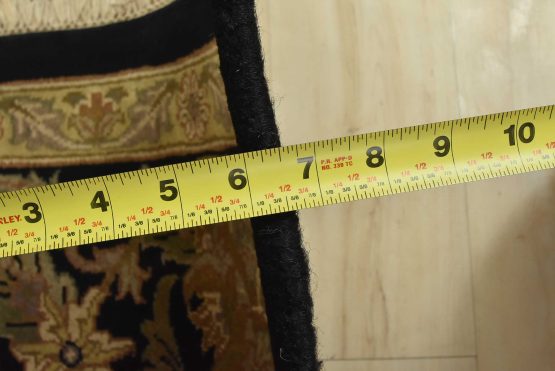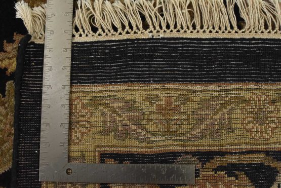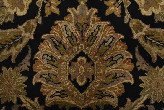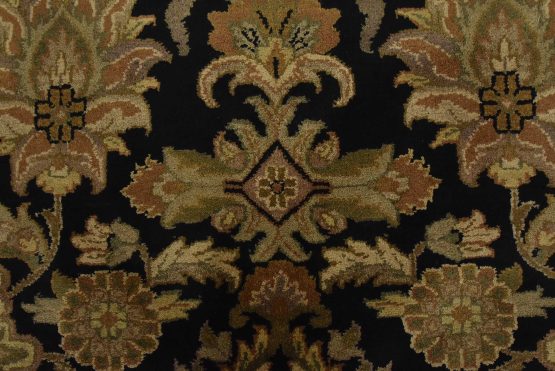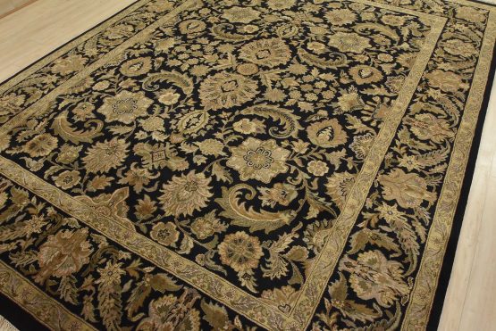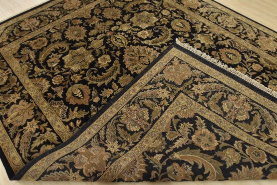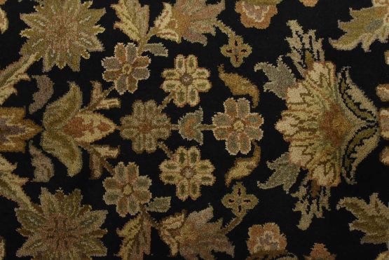 A traditional Agra rug is hand-knotted with an all-wool pile on a cotton foundation. This finely woven oriental rug features an all-over floral design set against a black background. It is new and in excellent condition.