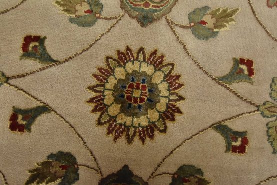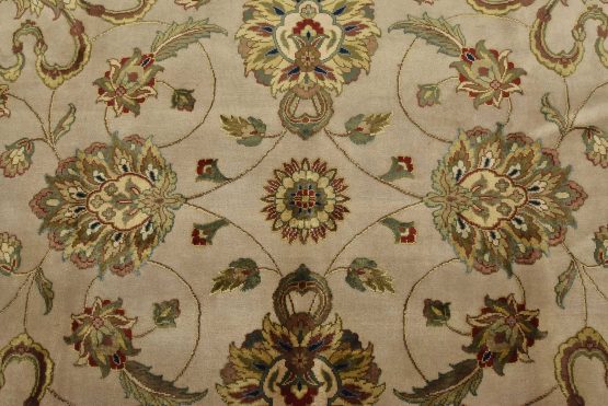 A traditional Agra rug is hand-knotted with a wool and silk pile on a cotton foundation. This finely woven oriental rug features an all-over floral design set against a gray background. It is new and in excellent condition.