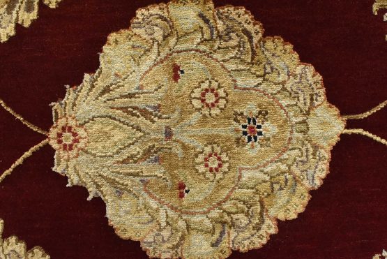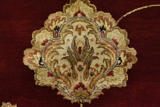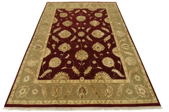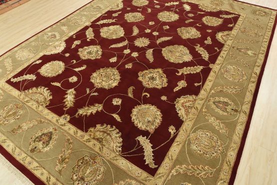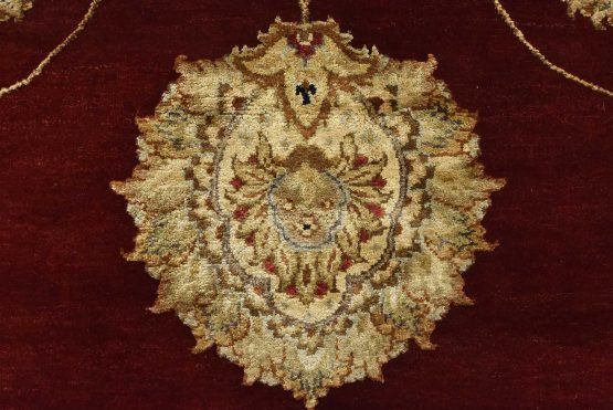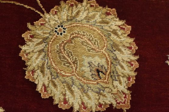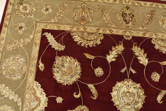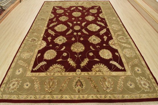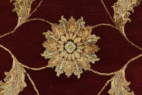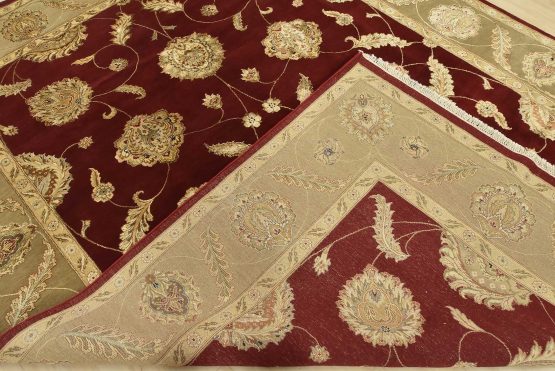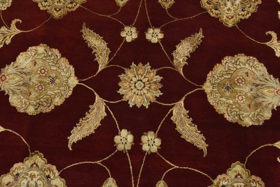 A traditional Agra rug is hand-knotted with a wool and silk pile on a cotton foundation. This finely woven oriental rug features an all-over floral design set against a red background. It is new and in excellent condition.