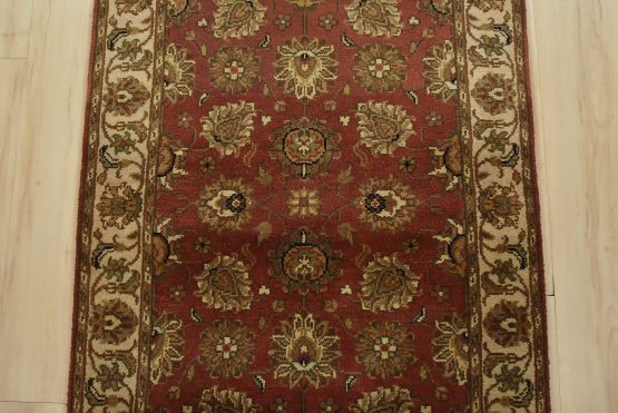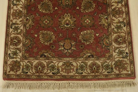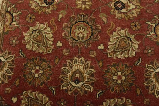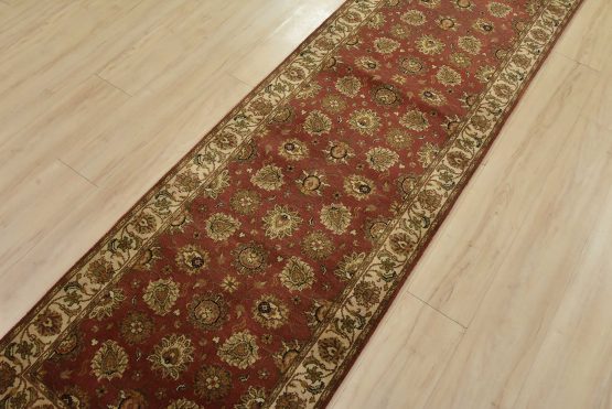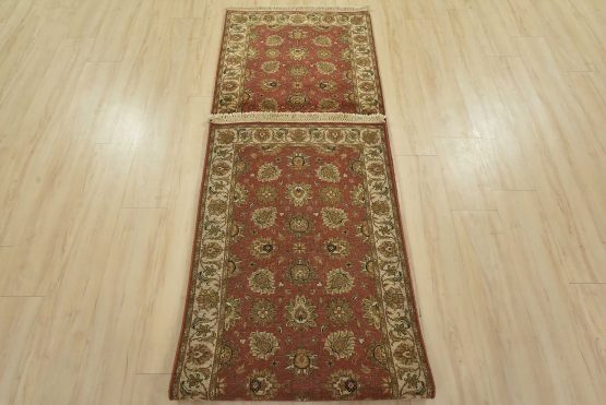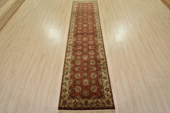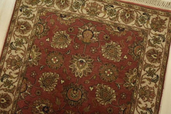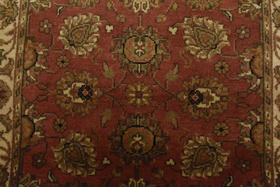 A traditional Agra runner hand-knotted with an all-wool pile on a cotton foundation. This finely woven oriental rug features an all-over floral design set against a pink background. It is new and in excellent condition.
