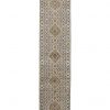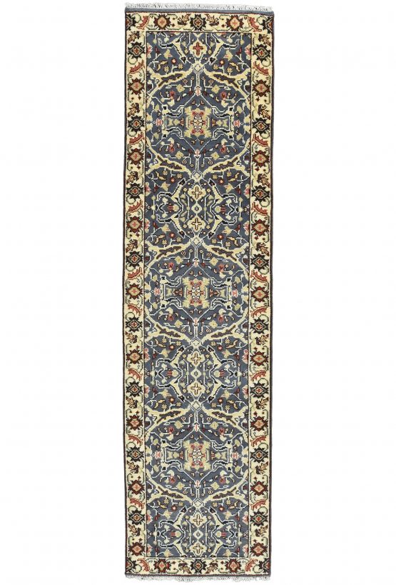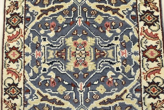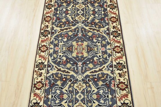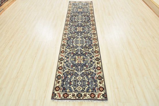 A traditional Heriz runner hand-knotted with an all-wool pile on a cotton foundation. This oriental rug features a row of medallions surrounded by a botanical design set against a blue background. It is new and in excellent condition.