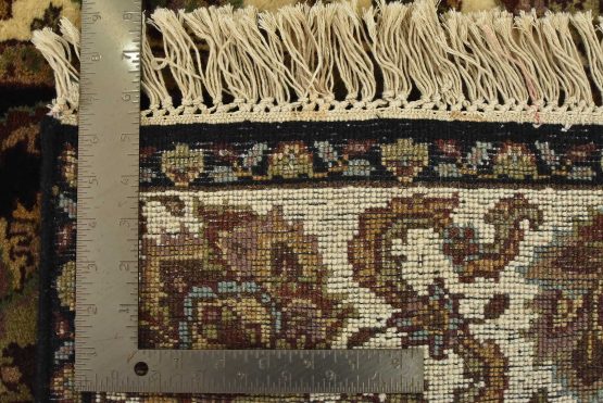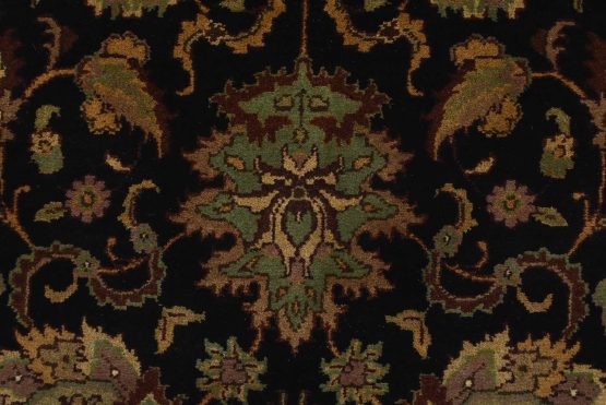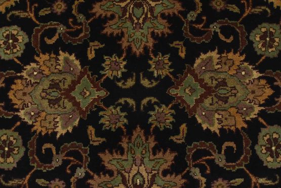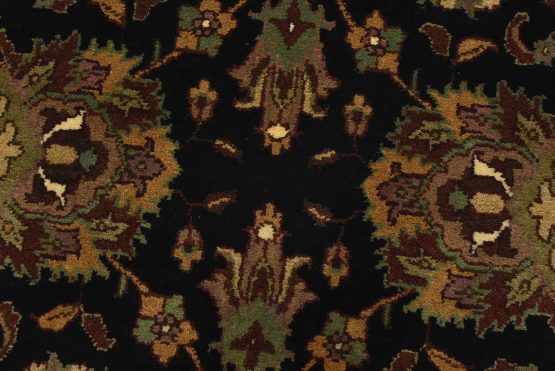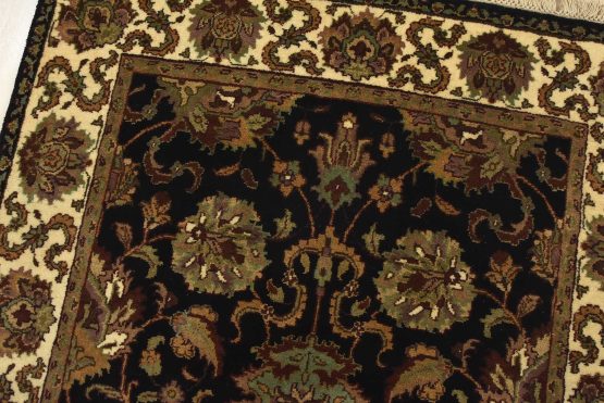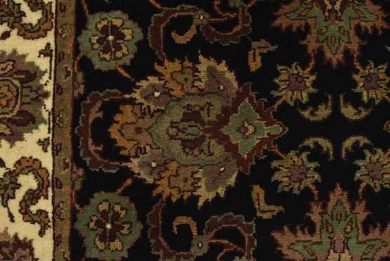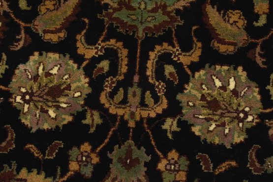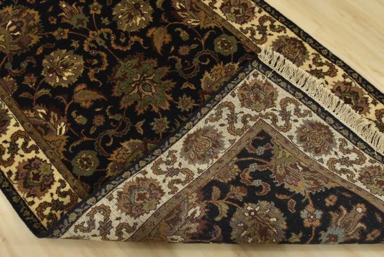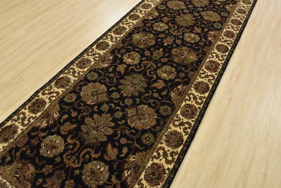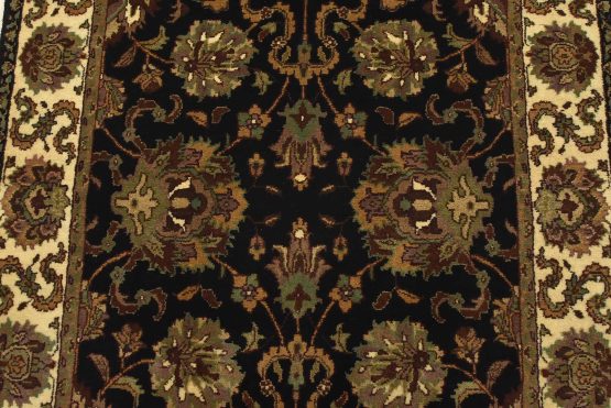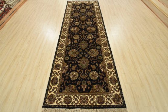 A traditional Agra runner hand-knotted with an all-wool pile on a cotton foundation. This finely woven oriental rug features an all-over floral design set against a black background. It is new and in excellent condition.
