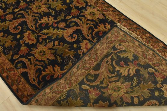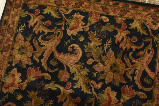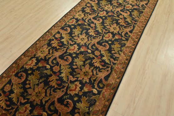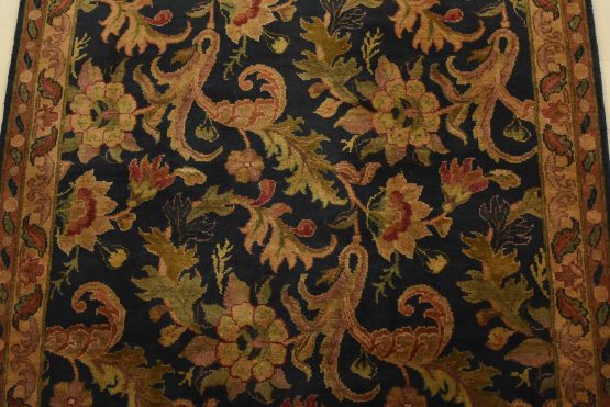 A traditional Agra runner hand-knotted with an all-wool pile on a cotton foundation. This finely woven oriental rug features an all-over floral design set against a blue background. It is new and in excellent condition.