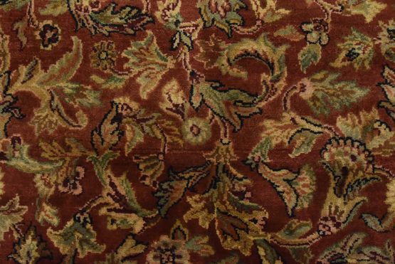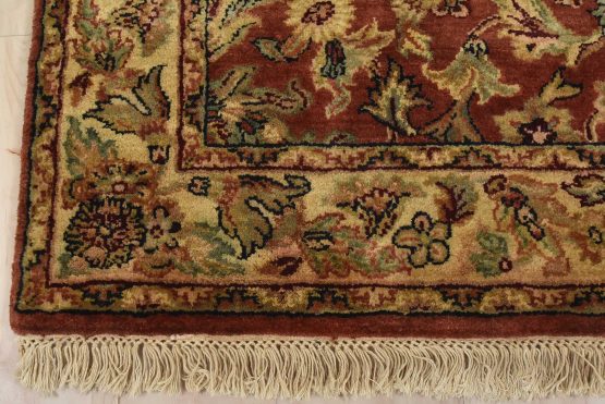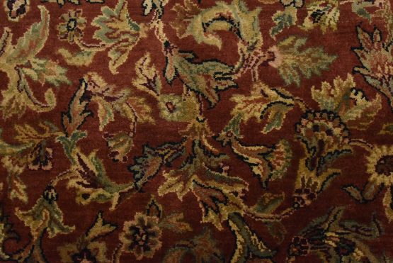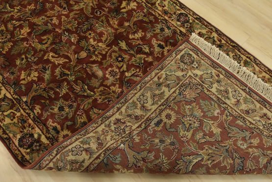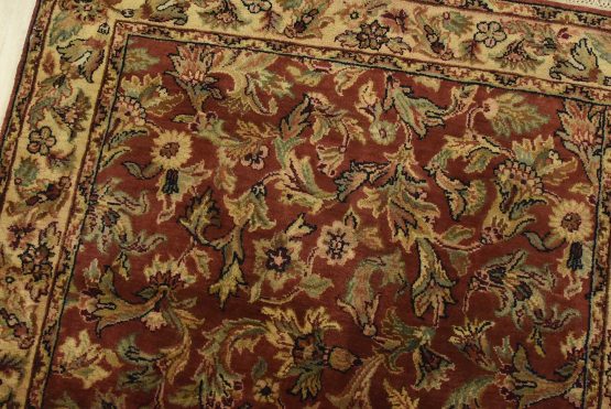 A traditional Agra runner hand-knotted with an all-wool pile on a cotton foundation. This finely woven oriental rug features an all-over floral design set against a red background. It is new and in excellent condition.