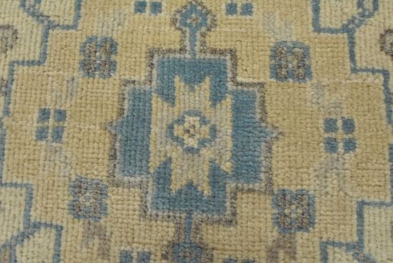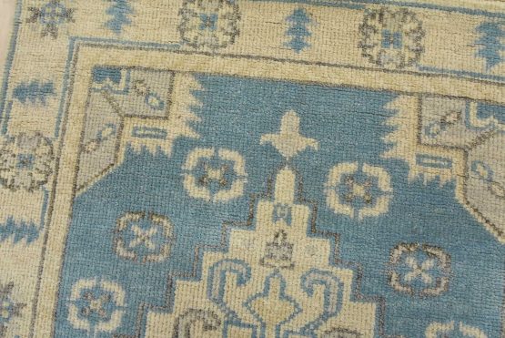 A modern tribal Anatolia rug hand-knotted with an all-wool pile on a cotton foundation. This oriental rug features a central geometric medallion set against a blue background. It is new and in excellent condition.