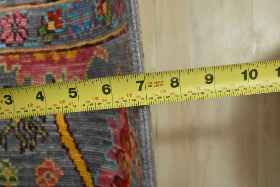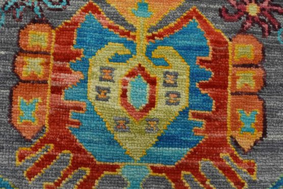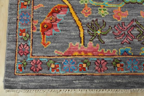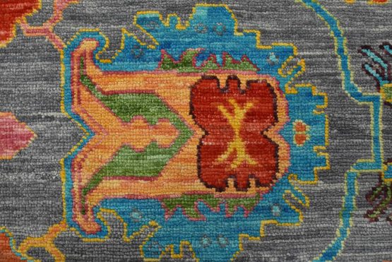 A modern traditional Anatolia rug hand-knotted with an all-wool pile on a cotton foundation. This oriental rug features a vibrant, all-over botanical design set against a gray background. It is new and in excellent condition.
