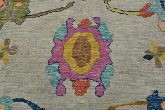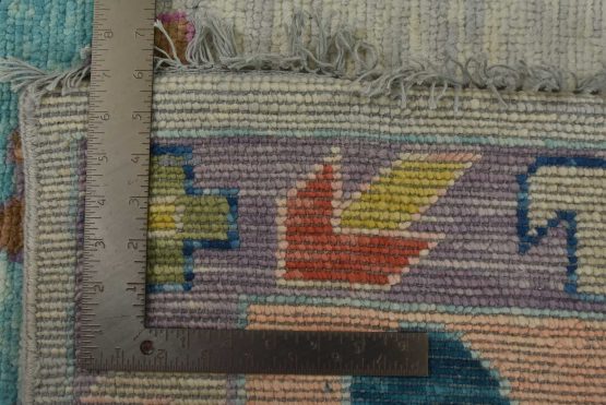 A modern traditional Anatolia rug hand-knotted with an all-wool pile on a cotton foundation. This oriental rug features rows of large botanical motifs set against a light blue background. It is new and in excellent condition.