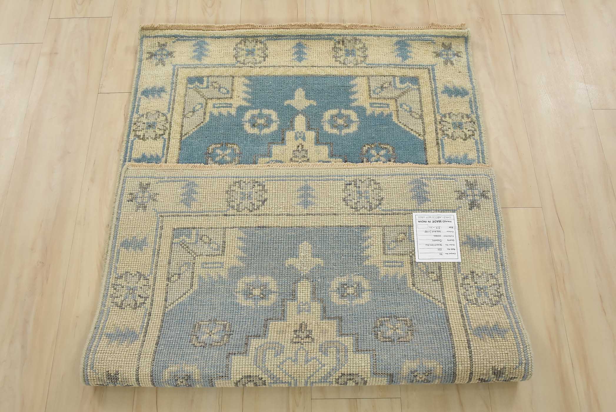 A modern tribal Anatolia rug hand-knotted with an all-wool pile on a cotton foundation. This oriental rug features a central geometric medallion set against a blue background. It is new and in excellent condition.