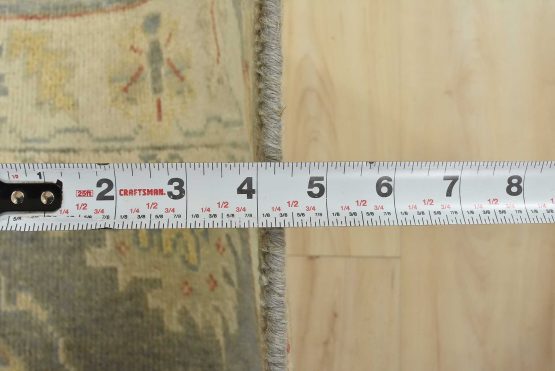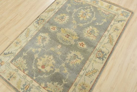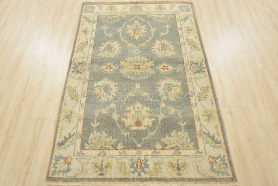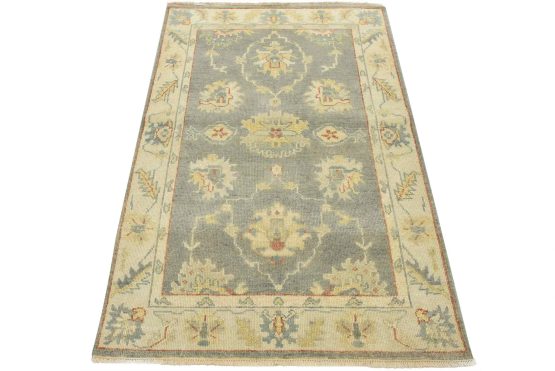 A traditional Anatolia rug hand-knotted with an all-wool pile on a cotton foundation. This oriental rug features a muted all-over botanical pattern set against a gray background. It is new and in excellent condition.